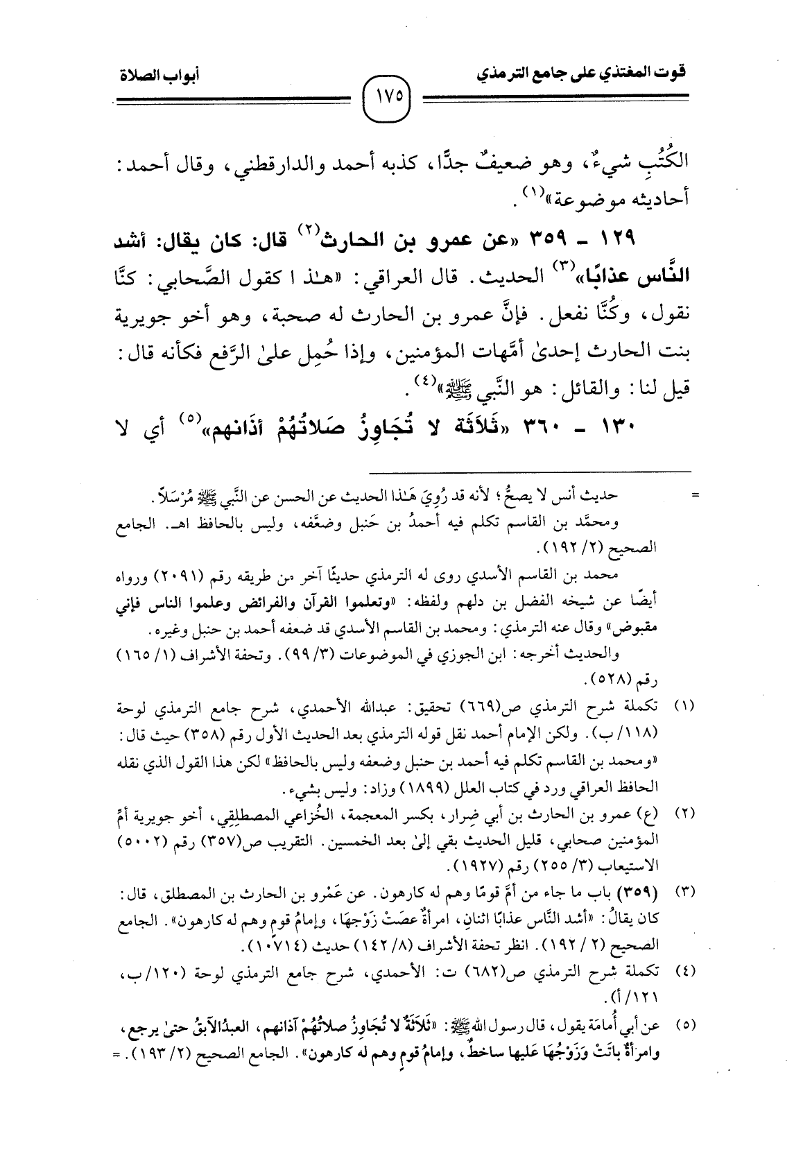 (¬1) تكملة شرح الترمذي ص (669) تحقيق: عبد الله الأحمدي، شرح جامع الترمذي لوحة (118/ب) . ولكن الإمام أحمد نقل قوله الترمذي بعد الحديث الأول رقم (358) حيث قال: " ومحمد بن القاسم تكلم فيه أحمد بن حنبل وضعفه وليس بالحافظ " لكن هذا القول الذي نقله الحافظ العراقي ورد في كتاب العلل (1899) وزاد: وليس بشيء.