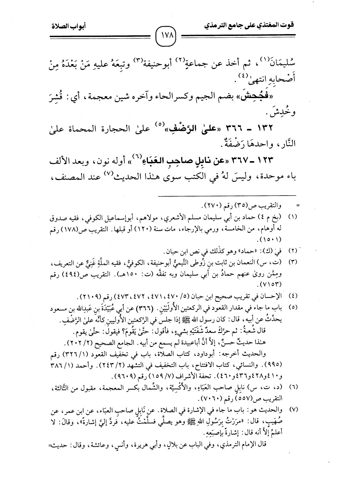 (¬2) والحديث هو: باب ما جاء في الإشارة في الصلاة. عن نَابِلٍ صاحبِ العبَاء، عن ابن عمر، عن صُهَيب، قال: " مرَرْتُ بِرَسُولِ اللهِ - صَلَّى اللَّهُ عَلَيْهِ وَسَلَّمَ - وهو يصلِّي فسلَّمتُ عليه، فردَّ إليَّ إشارةً "، وقالَ: لا أعلمُ إلاَّ أنه قال: إشارةً بإصبَعِهِ.