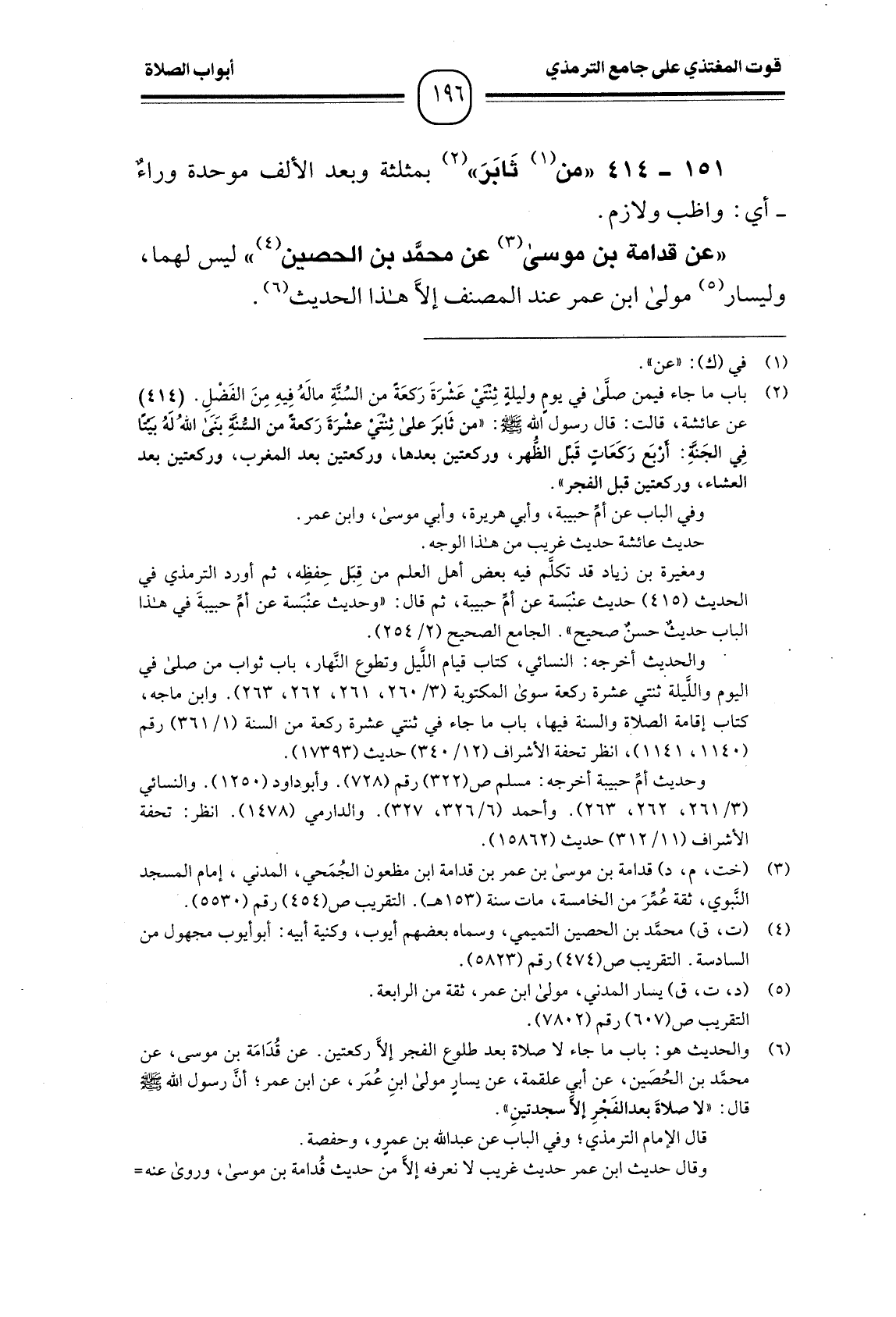 (¬6) والحديث هو: باب ما جاء لا صلاة بعد طلوع الفجر إلاَّ ركعتين. عن قُدَامَة بن موسى، عن محمَّد بن الحُصَين، عن أبي علقمة، عن يسارٍ مولى ابنِ عُمَر، عن ابن عمر؛ أنَّ رسول الله - صَلَّى اللَّهُ عَلَيْهِ وَسَلَّمَ - قال: " لا صلاةَ بعد الفَجْرِ إلاَّ سجدتينِ ".