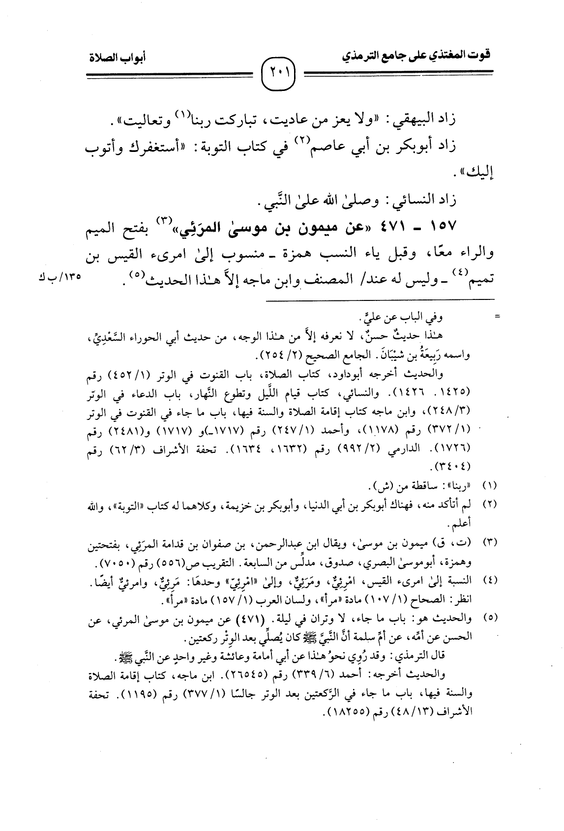 157 -[471] " عن ميمون بن موسى المرَئِي " (¬1) بفتح الميم والراء معًا، وقبل ياء النسب همزة -منسوب إلى امرىء القيس بن تميم (¬2) - وليس له عند المصنف وابن ماجه إلاَّ هذا الحديث (¬3) .