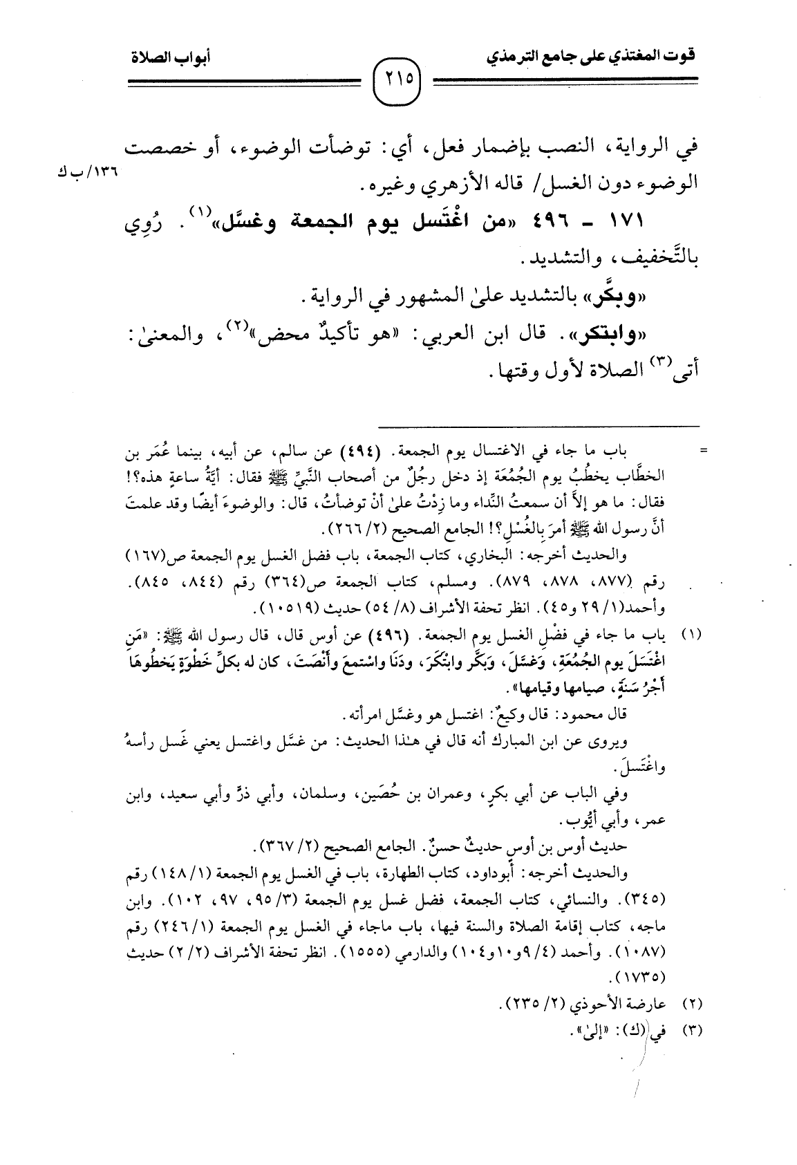 171 -[496] " من اغْتَسل يوم الجمعة وغسَّل " (¬1) . رُوِي بالتَّخفيف، والتشديد.