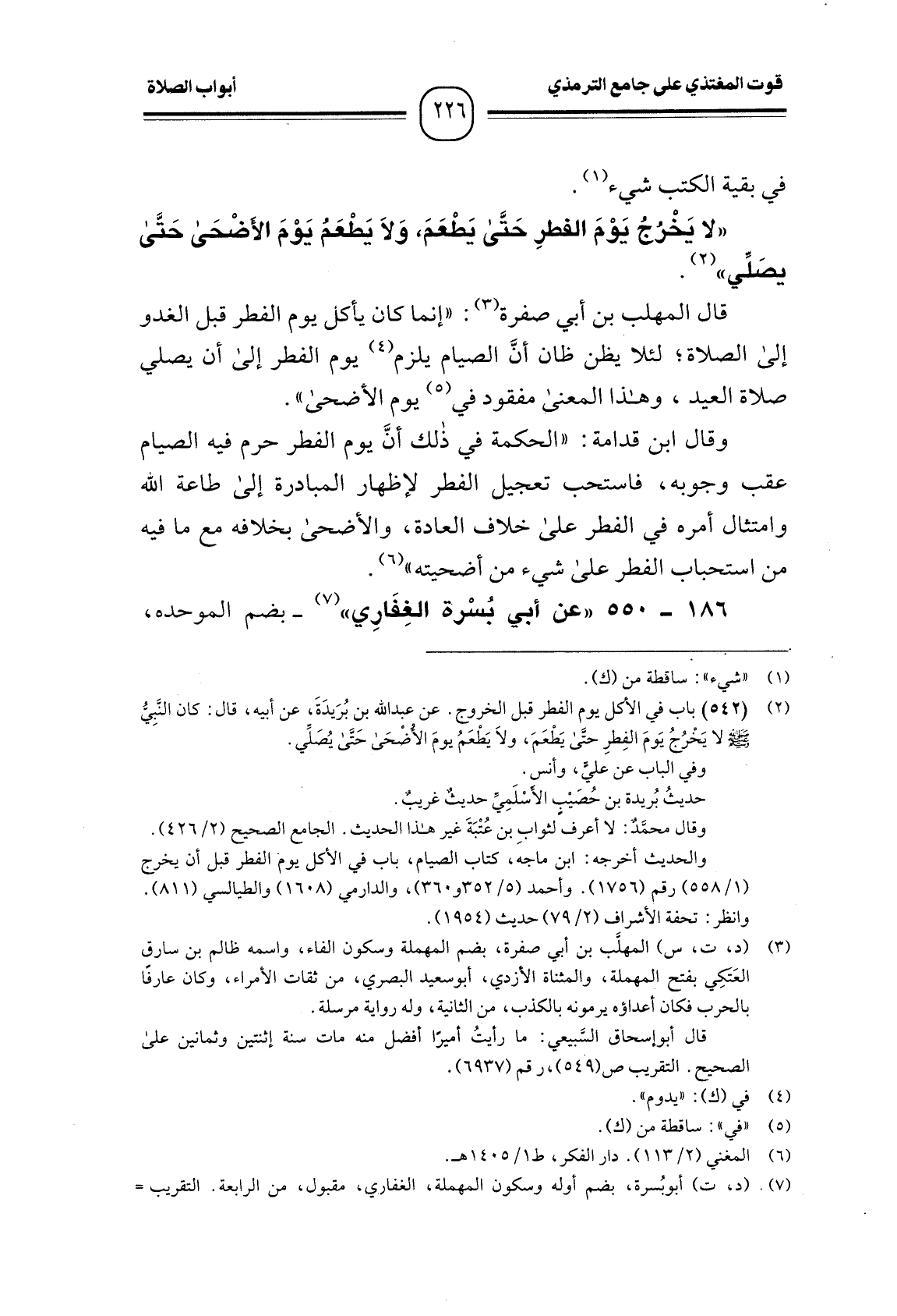 (¬2) (542) باب في الأكل يوم الفطر قبل الخروج. عن عبد الله بن بُرَيدَةَ، عن أبيه، قال: كان النبِي - صَلَّى اللَّهُ عَلَيْهِ وَسَلَّمَ - لا يَخْرُجُ يَومَ الفِطرِ حتَّى يَطْعَمَ، ولاَ يَطْعَمُ يومَ الأضْحَى حَتى يُصَلِّي.