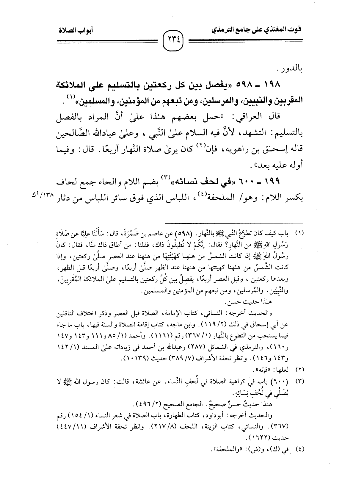 قال العراقي: "حمل بعضهم هذا على أنَّ المراد بالفصل بالتسليم: التشهد، لأنَّ فيه السلام على النَّبي، وعلى عباد الله الصَّالحين قاله إسحق بن راهويه، فإن (¬2) كان يرى صلاة النَّهار أربعًا. قال: وفيما أوله عليه بعد".