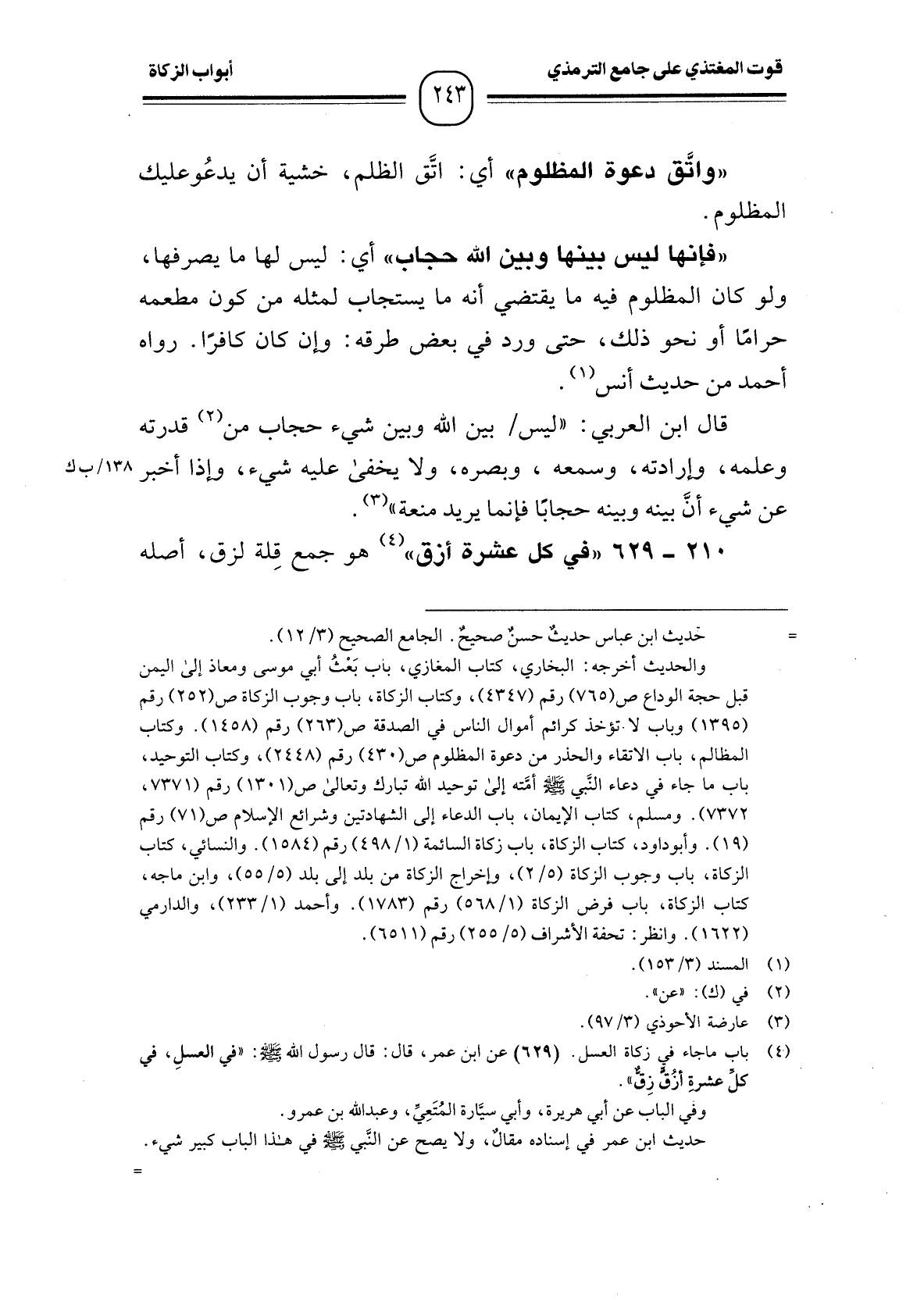 (¬1) باب ما جاء في زكاة العسل. (629) عن ابن عمر، قال: قال رسول الله - صَلَّى اللَّهُ عَلَيْهِ وَسَلَّمَ -: "في العسلِ، في كل عشرةِ أزُق زِق".