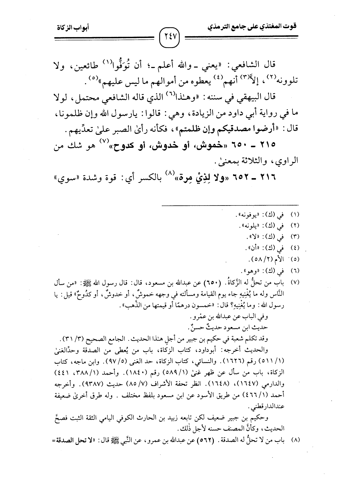 (¬1) باب من تحل له الزَكاةُ. (650) عن عبد الله بن مسعود، قال: قال رسول الله - صَلَّى اللَّهُ عَلَيْهِ وَسَلَّمَ -: "من سأل الناس وله ما يُغْنِيهِ جاء يوم القيامة ومسألته في وجهه خموشٌ، أو خدوشٌ، أو كدُوحٌ" قيل: يا رسول الله: وما يُغْنِيهِ؛ قال: " خمسون درهمًا أو قيمتها من الذَّهب ".