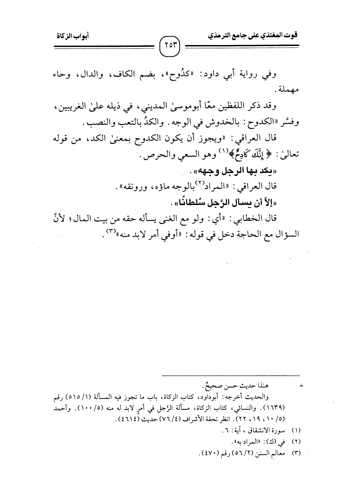 قال العراقي: " ويجوز أن يكون الكدوح بمعنى الكد، من قوله تعالى: {إِنَّكَ كَادِحٌ} (¬1) وهو السعي والحرص ".