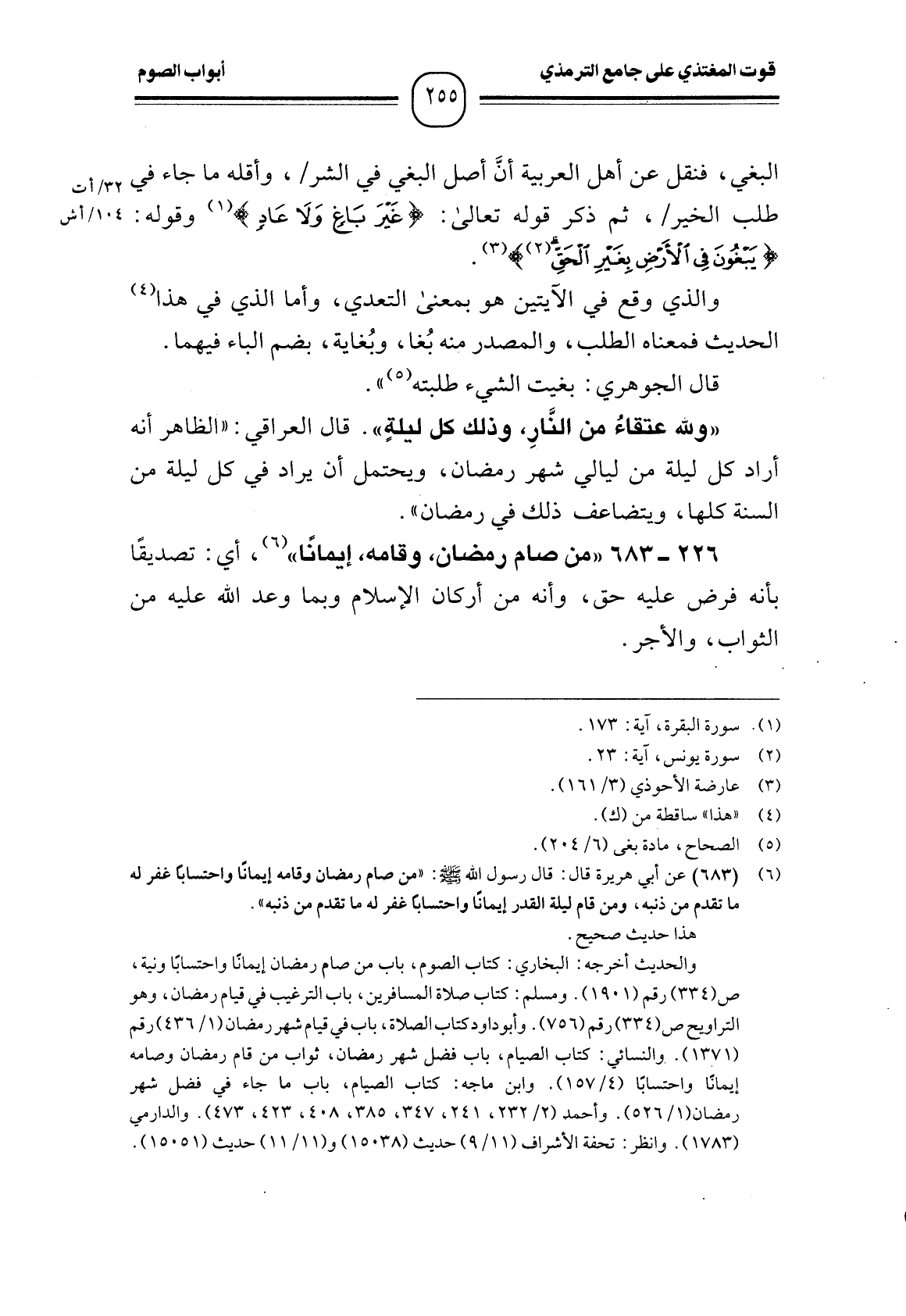 (¬1) (683) عن أبي هريرة قال: قال رسول الله - صَلَّى اللَّهُ عَلَيْهِ وَسَلَّمَ -: "من صام رمضان وقامه إيمانًا واحتسابًا غفر له ما تقدم من ذنبه، ومن قام ليلة القدر إيمانًا واحتسابًا غفر له ما تقدم من ذنبه".