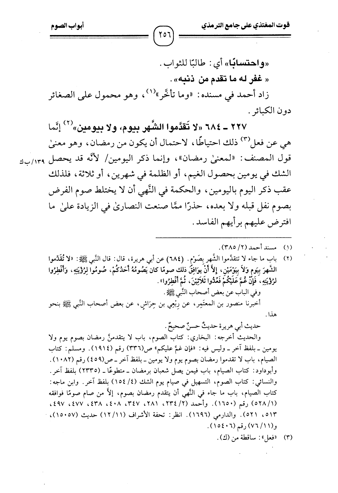 (¬1) باب ما جاء لا تتقدموا الشَهر بِصَوْم. (684) عن أبي هريرة، قال: قال النَّبي - صَلَّى اللَّهُ عَلَيْهِ وَسَلَّمَ -: "لا تُقَدموا الشَّهرَ بيَومٍ وَلاَ بيَوْمَيْنِ، إِلا أنْ يوَافِقُ ذلك صومًا كان يَصُومُهُ أحَدُكُمْ، صُومُوا لِرُؤيَتِهِ، وَأفْطِرُوا لرُؤيَتِهِ، َ فَإنْ غمَ علَيكُمْ فَعُدُّوا ثَلاَثِيْنَ، ثُمَّ أفْطِرُوا".