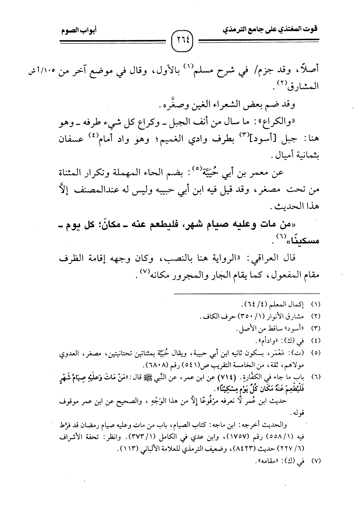 (¬6) باب ما جاء في الكفارةِ. (714) عن ابن عمر، عن النَّبي - صَلَّى اللَّهُ عَلَيْهِ وَسَلَّمَ - قال: "مَنْ مَاتَ وَعلَيه صيَامُ شَهر فَلْيطْعِمْ عَنْهُ مَكَان كُل يَوم مِسْكِينًا".
