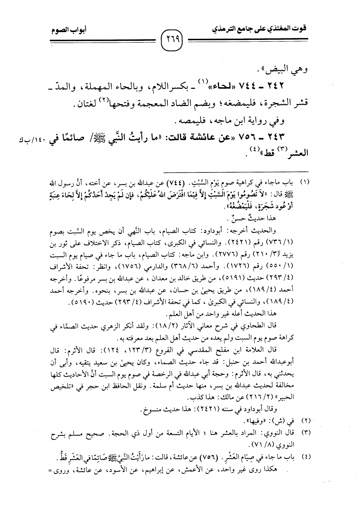 (¬1) باب ما جاء في كراهية صومِ يَوْمِ السَّبْتِ. (744) عن عبد الله بن بسر، عن أخته، أن رسول الله - صَلَّى اللَّهُ عَلَيْهِ وَسَلَّمَ - قال: " لاَ تَصُومُوا يَوْمَ السبْتِ إلاَّ فِيْمَا افْتَرَضَ اللهُ عَلَيْكُمْ، فإن لَمْ يَجِدْ أحَدُكُمْ إلاَّ لِحَاءَ عِنبه أو عُود شَجَرَةٍ، فَلْيَمضُغْهُ ".
