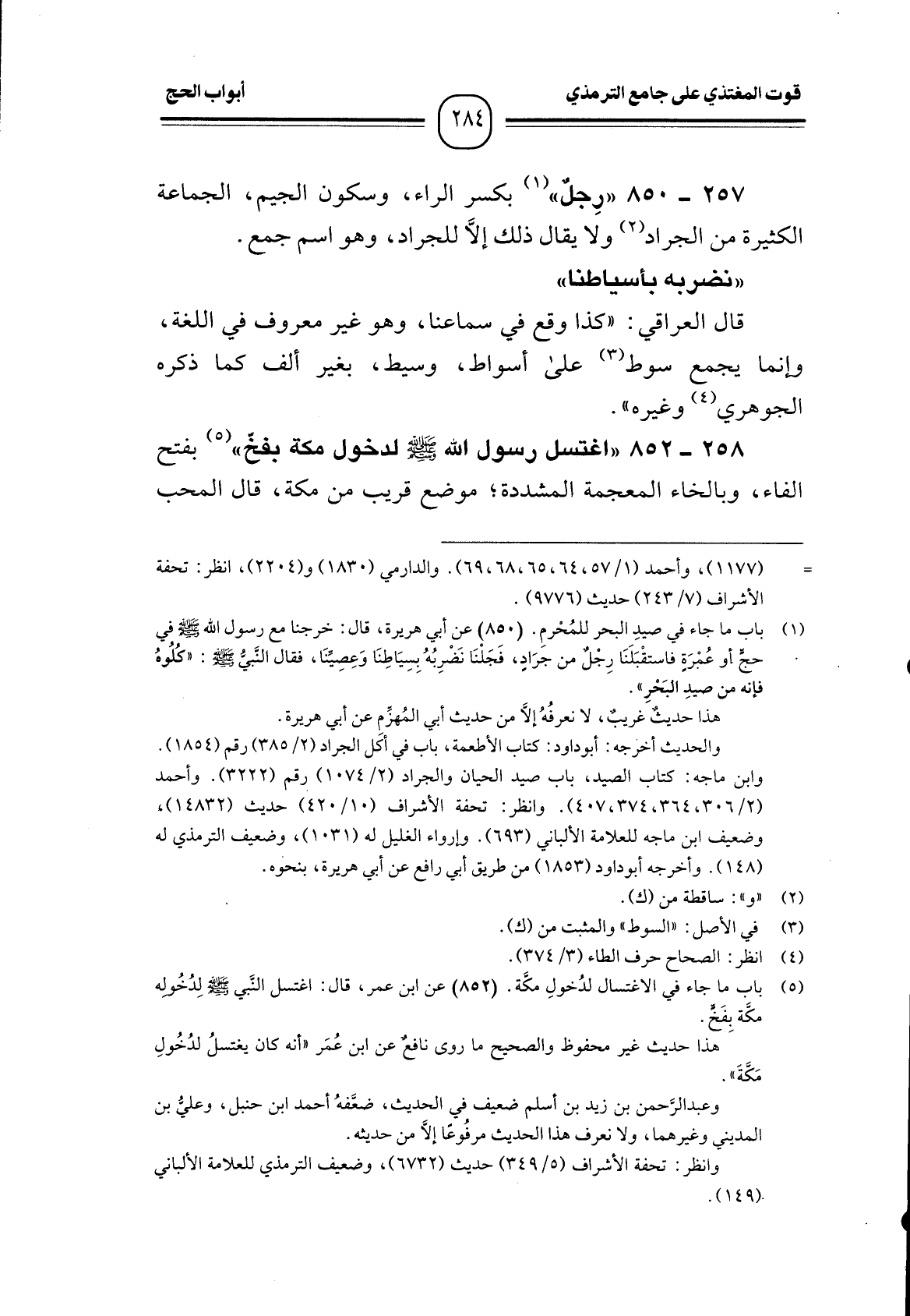 258 -[852] "اغتسل رسول الله - صَلَّى اللَّهُ عَلَيْهِ وَسَلَّمَ - لدخول مكة بفخّ" (¬1) بفتح الفاء، وبالخاء المعجمة المشددة؛ موضع قريب من مكة، قال المحب