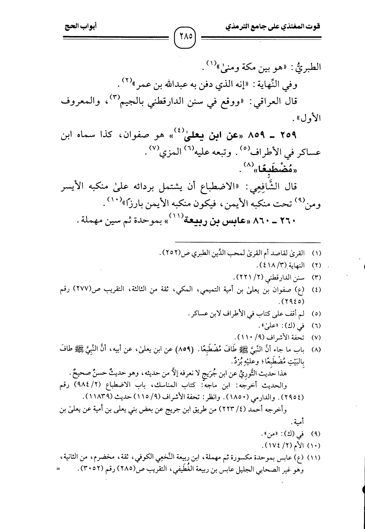 (¬5) باب ما جاء أن النَّبي - صَلَّى اللَّهُ عَلَيْهِ وَسَلَّمَ - طَافَ مُضْطَبِعًا. (859) عن ابن يعلى، عن أبيه، أن النبِي - صَلَّى اللَّهُ عَلَيْهِ وَسَلَّمَ - طافَ بِالبَيْتِ مُضطَبعًا؛ وعليْهِ بُرْدٌ.