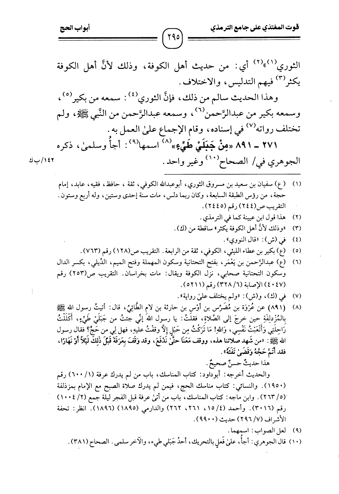 (¬1) (891) عن عُرْوَة بن مُضَرس بن أوْسِ بن حارثة بن لام الطَّائِي، قال: أتيتُ رسول الله - صَلَّى اللَّهُ عَلَيْهِ وَسَلَّمَ - بالمُزْدلِفَةِ حين خرجَ إلى الصَّلاةِ، فقلتُ: يا رسول الله إنِّي جئتُ من جَبَلَيْ طَيء، أَكْلَلْتُ راحِلَتِي وَأَتْعَبْتُ نَفْسِي، وَاللهِ! مَا تَرَكتُ مِن حَبْل إلا وقفْتُ عليهِ، فهل لِي من حَج؟ فقال رسول الله - صَلَّى اللَّهُ عَلَيْهِ وَسَلَّمَ -: "من شَهد صلاتنا هذه، ووقف مَعَنا حتَّى ندْفَعَ، وقد وَقَفَ بِعَرَفَةَ قَبلَ ذلِكَ لَيْلاً أو نَهَارًا، فقد أتمَ حَجهُ وَقَضَى تَفَثه".