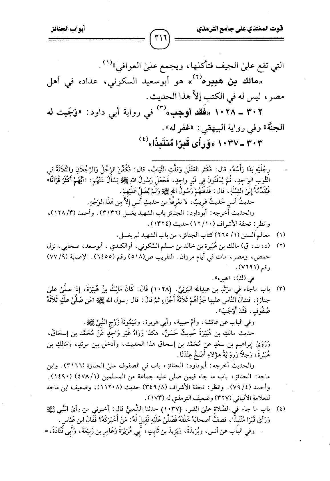 (¬1) باب ما جاء في مرْثَدِ بن عبدِ الله اليَزيي. (1028) قَالَ: كَانَ مَالِكُ بنُ هُبَيْرَةَ، إذا صلَّى على جنازة، فتقال الناس عليها جَزأهُمْ ثَلاَثَةَ أَجْزَاءٍ ثم قالَ: قال رسول الله - صَلَّى اللَّهُ عَلَيْهِ وَسَلَّمَ - "مَن صّلَّى علَيْهِ ثَلاَثَهُ صُفُوفٍ، فَقَدْ أوْجَبَ".