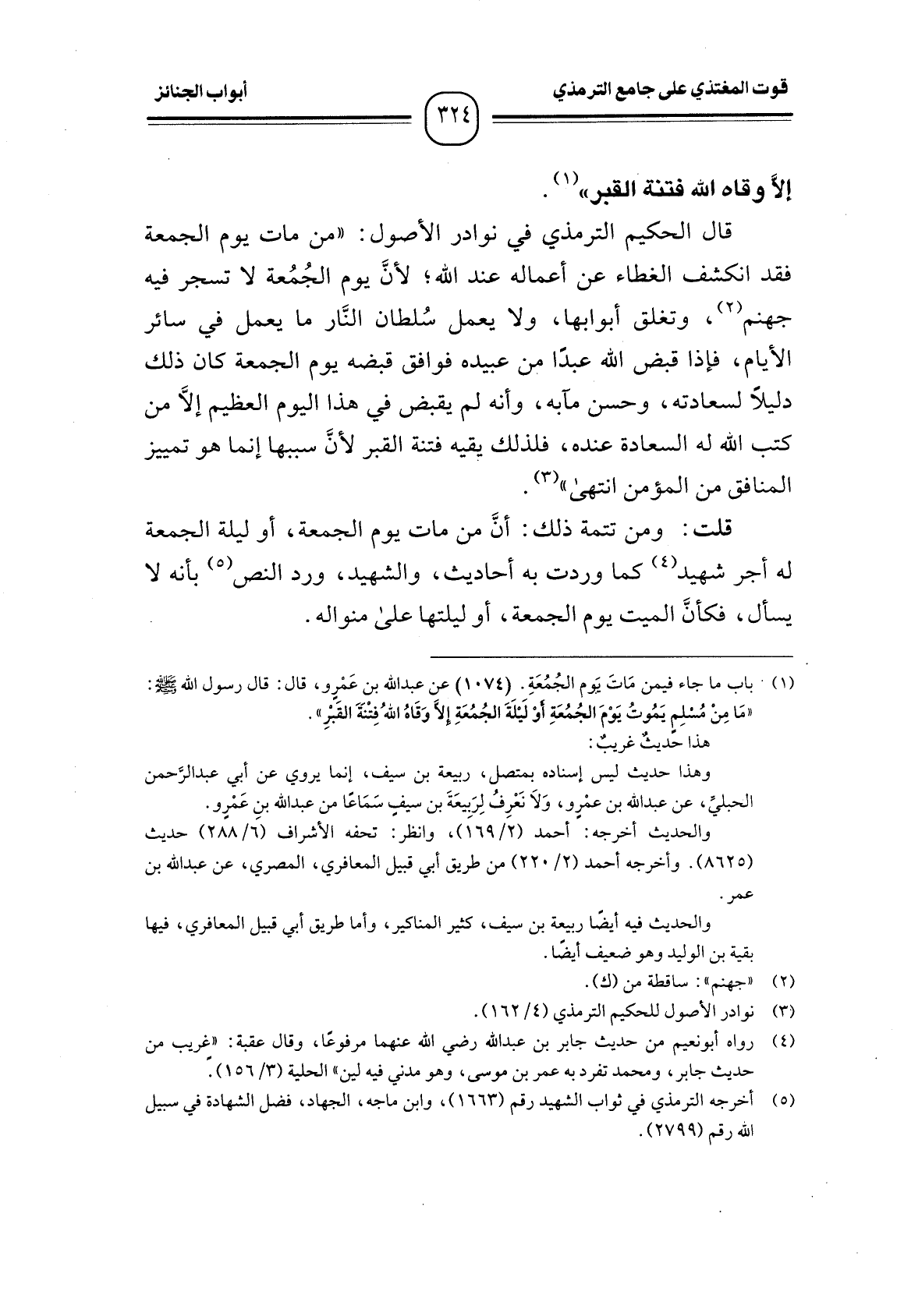 قال الحكيم الترمذي في نوادر الأصول: " من مات يوم الجمعة فقد انكشف الغطاء عن أعماله عند الله؛ لأنَّ يوم الجُمُعة لا تسجر فيه جهنم، وتغلق أبوابها، ولا يعمل سُلطان النَّار ما يعمل في سائر الأيام، فإذا قبض الله عبدًا من عبيده فوافق قبضه يوم الجمعة كان ذلك دليلاً لسعادته، وحسن مآبه، وأنه لم يقبض في هذا اليوم العظيم إلاَّ من كتب الله له السعادة عنده، فلذلك يقيه فتنة القبر لأنَّ سببها إنما هو تمييز المنافق من المؤمن انتهى".