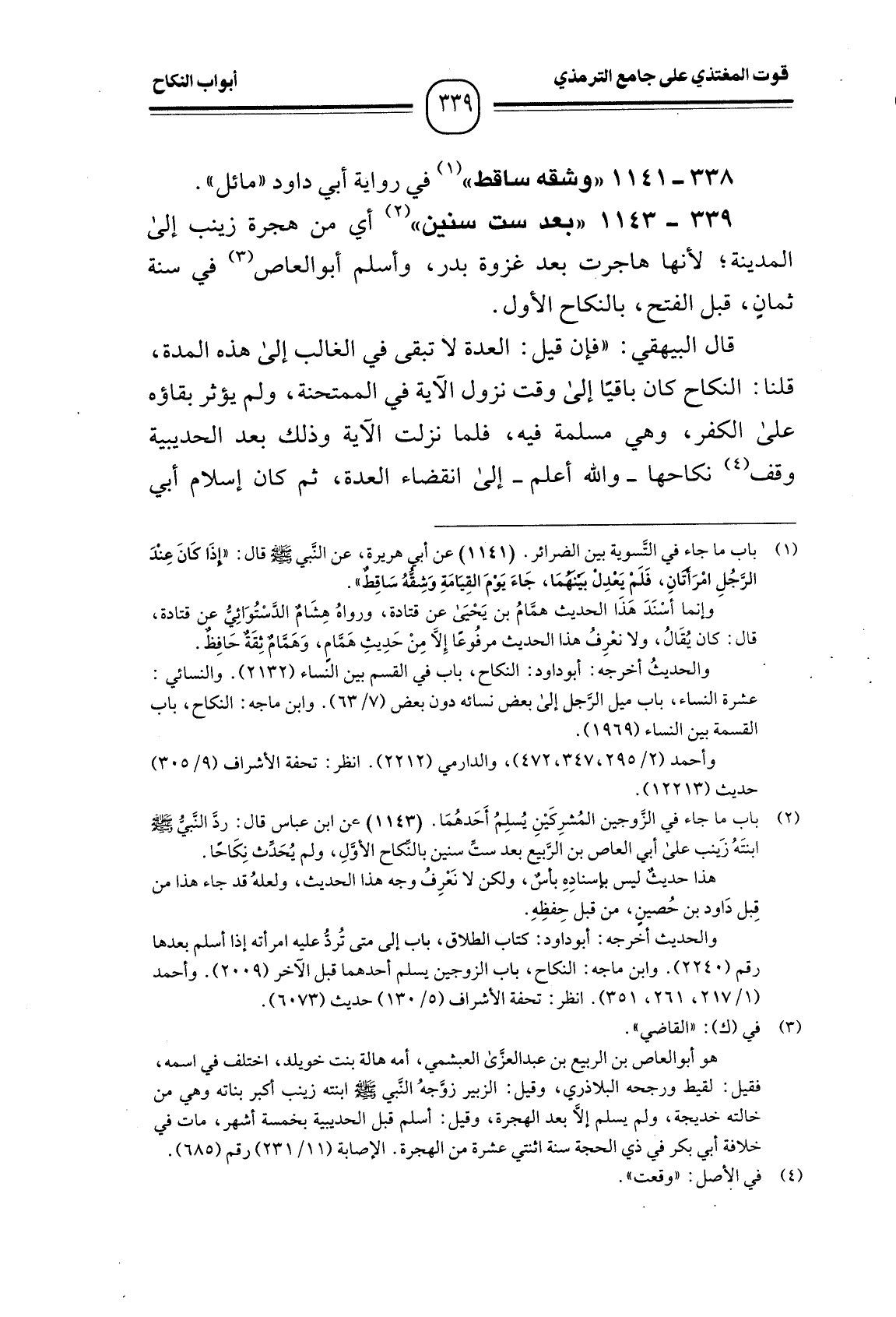339 -[1143] "بعد ست سنين" أي من هجرة زينب إلى المدينة؛ لأنها هاجرت بعد غزوة بدر، وأسلم أبو العاص في سنة ثمانٍ، قبل الفتح، بالنكاح الأول.