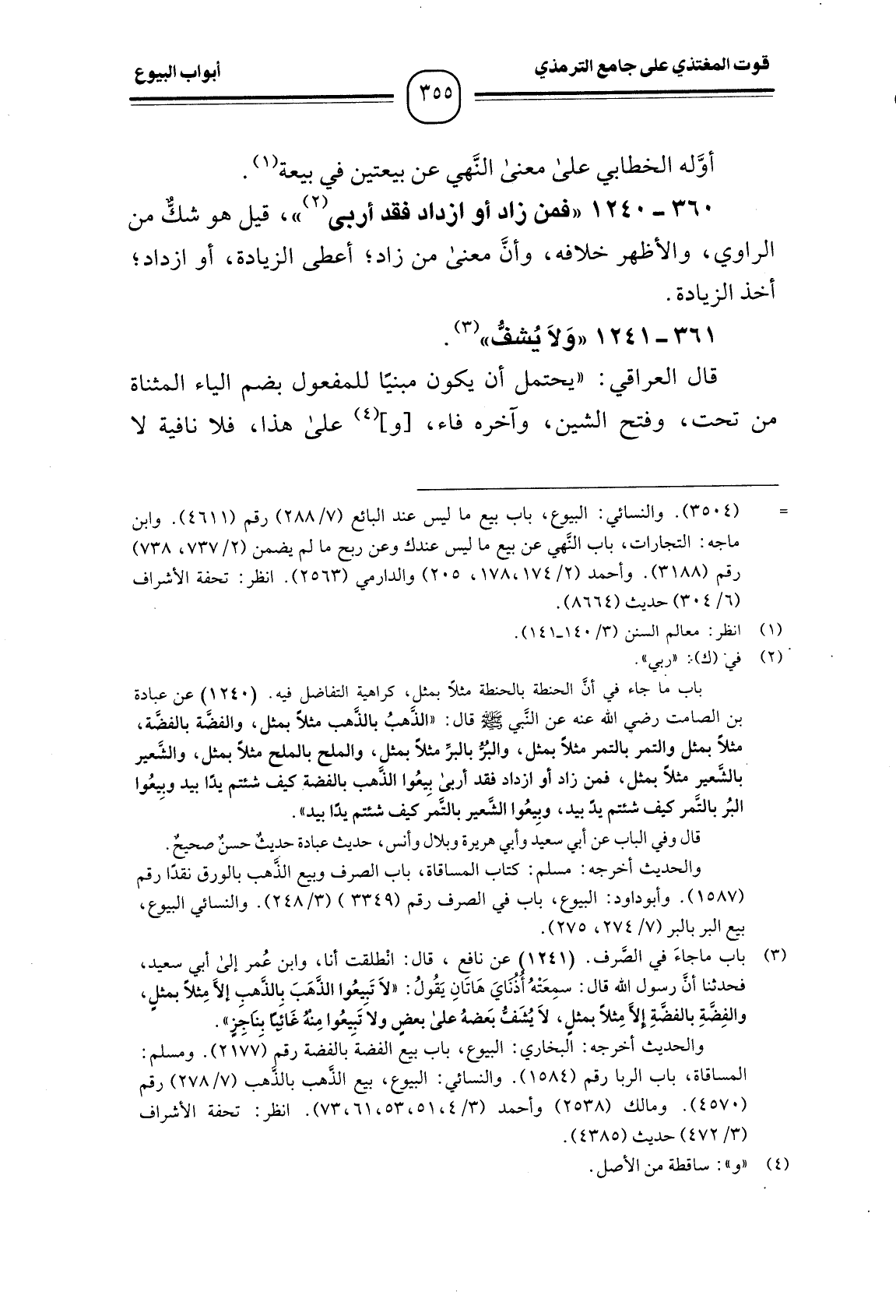 360 -[1240] "فمن زاد أو ازداد فقد أربى"، قيل هو شكٌّ من الراوي، والأظهر خلافه، وأنَّ معنى من زاد، أعطى الزيادة، أو ازداد؛ أخذ الزيادة.