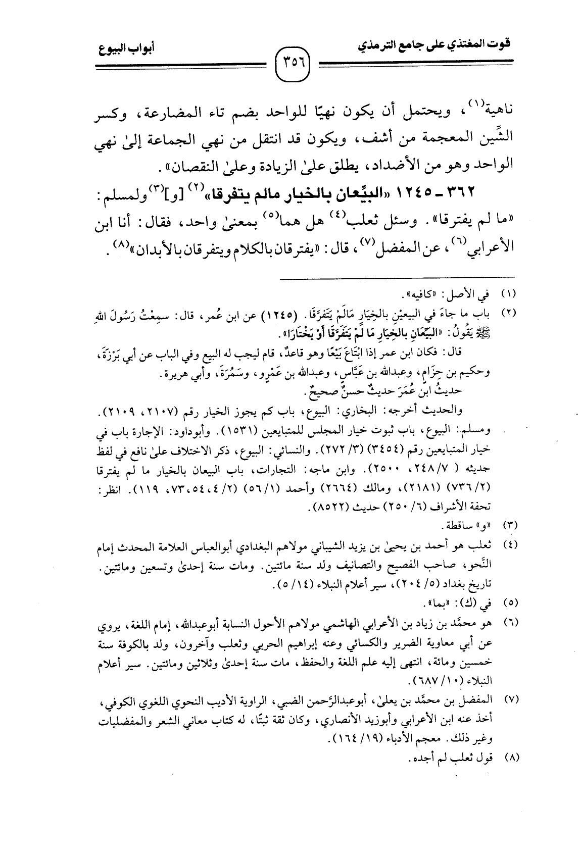 362 -[1245] "البيعان بالخيار ما لم يتفرقا" [و] ولمسلم: "ما لم يفترقا". وسئل ثعلب هل هما بمعنى واحد، فقال: أنا ابن الأعرابي، عن المفضل، قال: " يفترقان بالكلام ويتفرقان بالأبدان ".