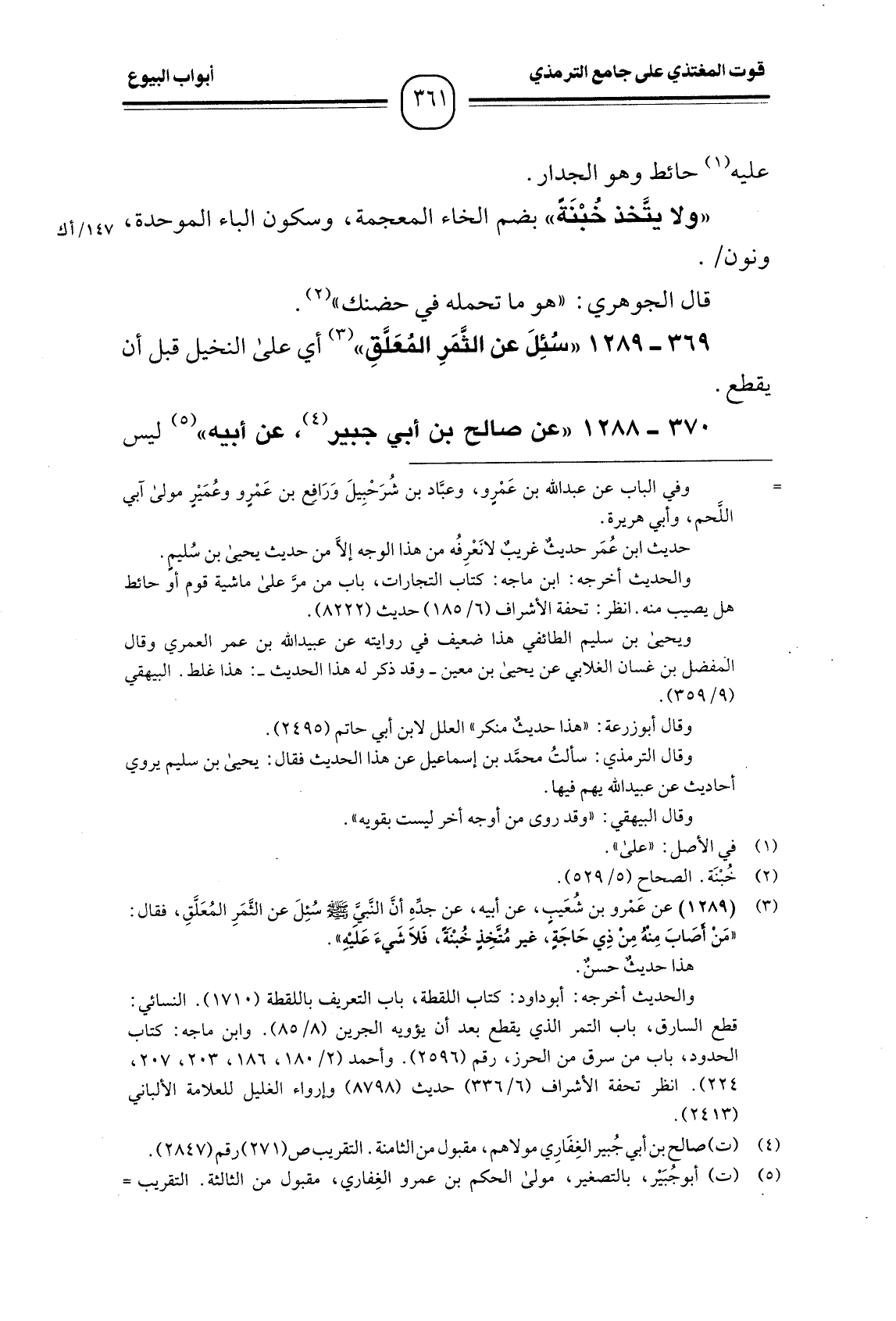 369 -[1289] "سُئِلَ عن الثَمَرِ المُعَلقِ" أي على النخيل قبل أن يقطع.