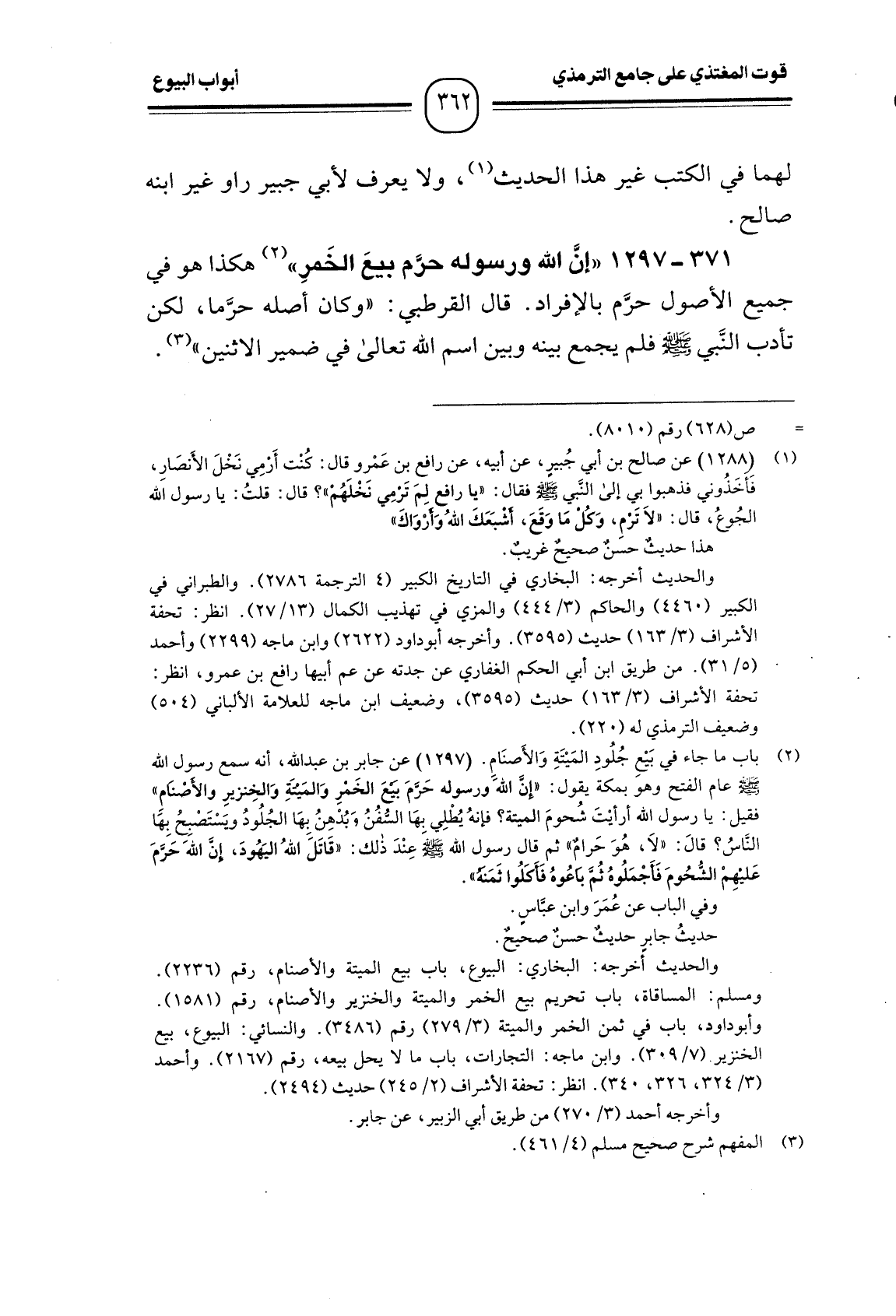 371 -[1297] "إن الله ورسوله حرَّم بيعَ الخَمرِ" هكذا هو في جميع الأصول حرَّم بالإفراد. قال القرطبي: " وكان أصله حرَّما، لكن تأدب النَّبي - صَلَّى اللَّهُ عَلَيْهِ وَسَلَّمَ - فلم يجمع بينه وبين اسم الله تعالى في ضمير الاثنين ".