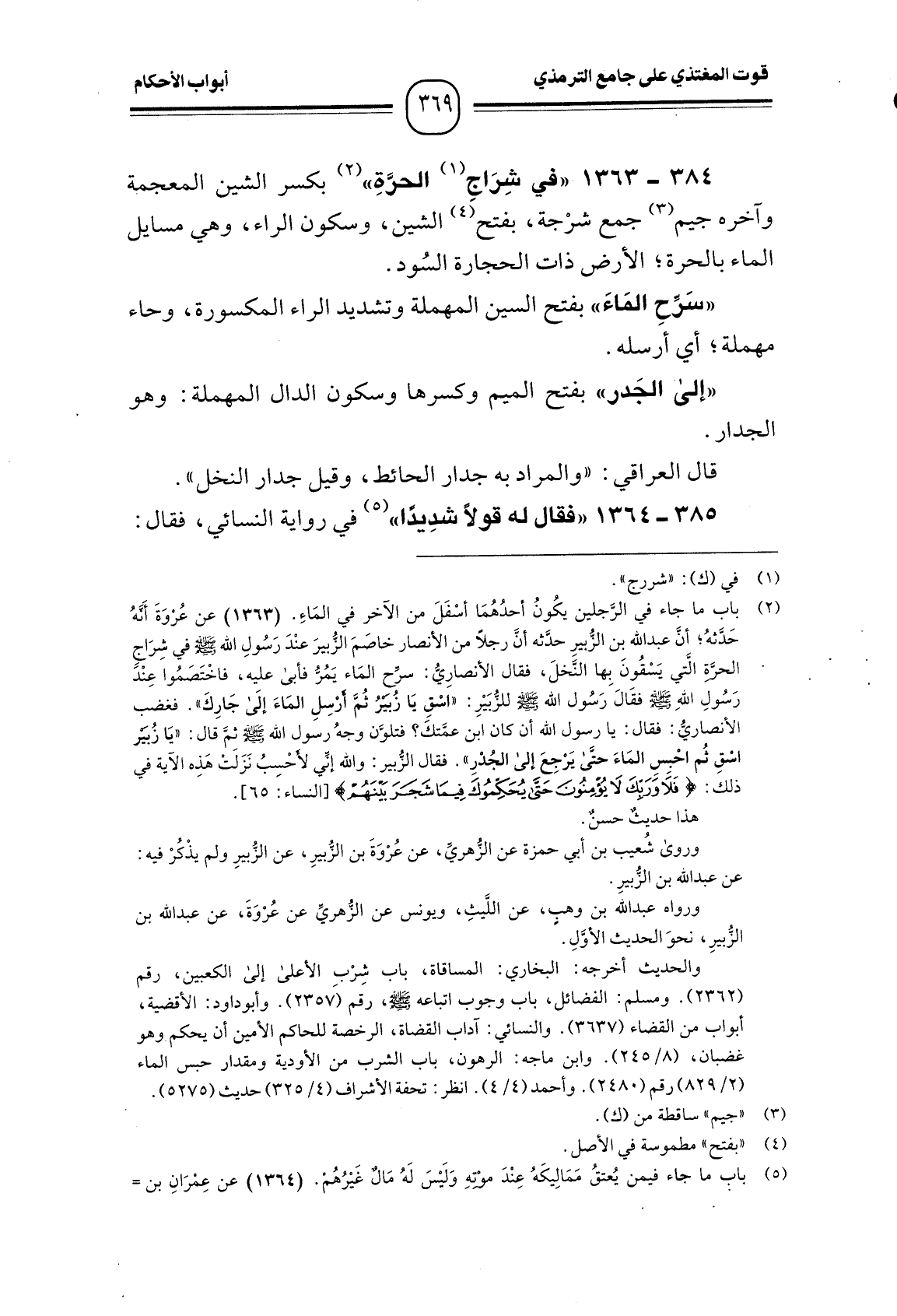 384 -[1363] "في شِرَاجِ الحرَّةِ" بكسر الشين المعجمة وآخره جيم جمع شرْجة، بفتح الشين، وسكون الراء، وهي مسايل الماء بالحرة؛ الأرض ذات الحجارة السُود.