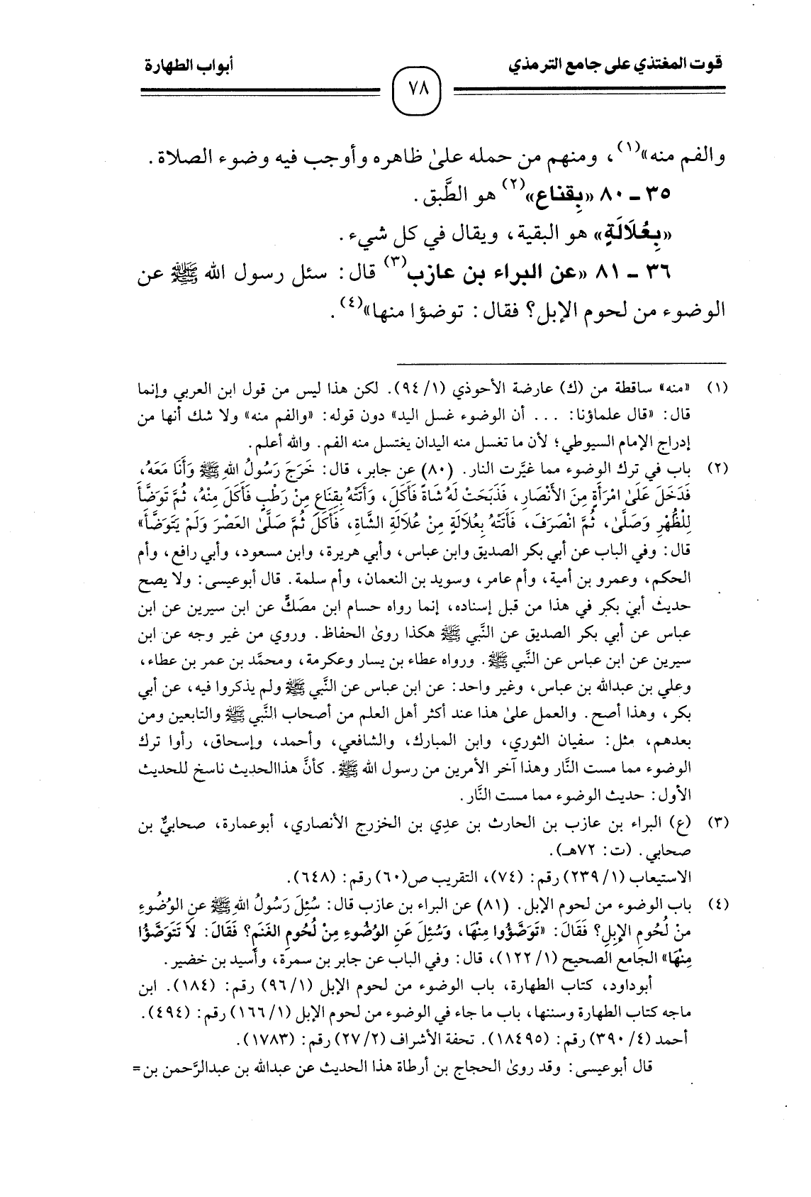 36 -[81] " عن البراء بن عازب (¬1) قال: سئل رسول الله - صَلَّى اللَّهُ عَلَيْهِ وَسَلَّمَ - عن الوضوء من لحوم الإبل؟ فقال: توضؤا منها " (¬2) .