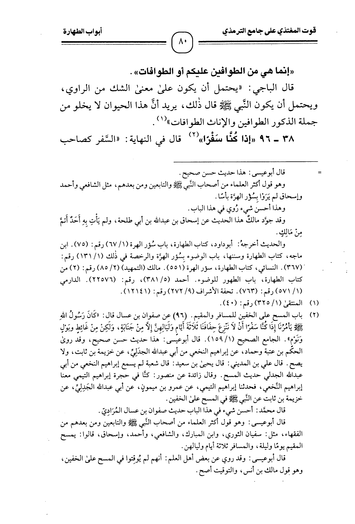 (¬1) باب المسحِ على الخفين للمسافر والمقيم. (96) عن صفوان بن عسال قال: " كَانَ رَسُولُ اللهِ - صَلَّى اللَّهُ عَلَيْهِ وَسَلَّمَ - يَأمُرُنَا إِذا كُنَّا سَفْرًا أَنْ لاَ ننزِعَ حِفَافَنَا ثَلاَثَةَ أَيَّامٍ وَلَيَالِهِنَّ إِلاَّ مِنْ جَنَابَةٍ، وَلَكِنْ مِنْ غَائِطٍ وبَوْلٍ وَنَوْمٍ ". الجامع الصحيح (1/159) . قال أبو عيسى: هذا حديث حسن صحيح، وقد روى الحكم بن عتبة وحماد، عن إبراهيم النخعي من أبي عبد الله الجدَلِيِّ، عن خزيمة بن ثابت، ولا يصح. قال علي بن المديني: قال يحيى بن سعيد: قال شعبة لم يسمع إبراهيم النخعي من أبي عبد الله الجدلي حديث المسح. وقال زائدة عن منصور: كنَّا في حجرة إبراهيم التيمي معنا إبراهيم النَّخعي، فحدثنا إبراهيم التيمي، عن عمرو بن ميمونِ، عن أبي عبد الله الجَدِلِيِّ، عن خزيمة بن ثابت عن النَّبي - صَلَّى اللَّهُ عَلَيْهِ وَسَلَّمَ - في المسح على الخفين.