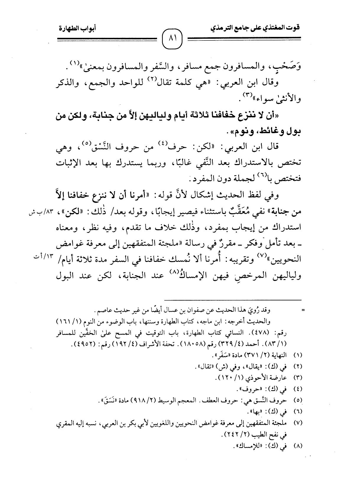 وفي لفظ الحديث إشكال لأنَّ قوله: " أمرنا أن لا ننزع خفافنا إلاَّ من جنابة " نفي مُعَقَّبٌ باستثناء فيصير إيجابًا، وقوله بعد ذلك: " لكن "، استدراك من إيجاب بمفرد، وذلك خلاف ما تقدم، وفيه نظر، ومعناه -بعد تأمل وفكر- مقررٌ في رسالة " ملجئة المتفقهين إلى معرفة غوامض النحويين " (¬7) وتقريبه: "أُمرنا ألا نُمسك خفافنا في السفر مدة ثلاثة أيام ولياليهن المرخصِ فيهن الإمساكُ (¬8) عند الجنابة، لكن عند البول
