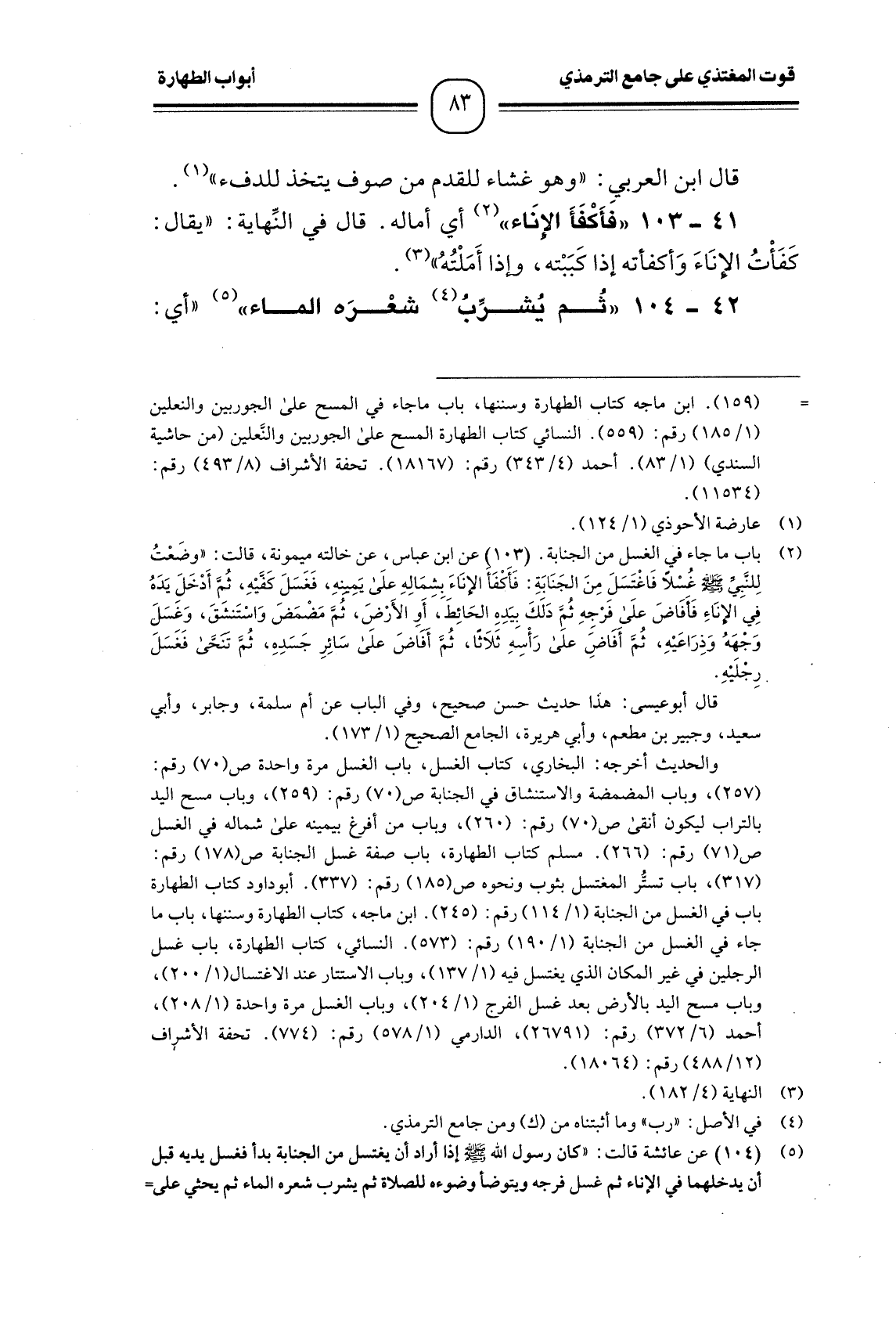 41 -[103] " فأَكْفَأَ الإنَاء " (¬1) أي أماله. قال في النِّهاية: " يقال: كَفَأْتُ الإنَاءَ وَأكفأته إذا كَبَبْته، وإذا أَمَلْتُهُ " (¬2) .
