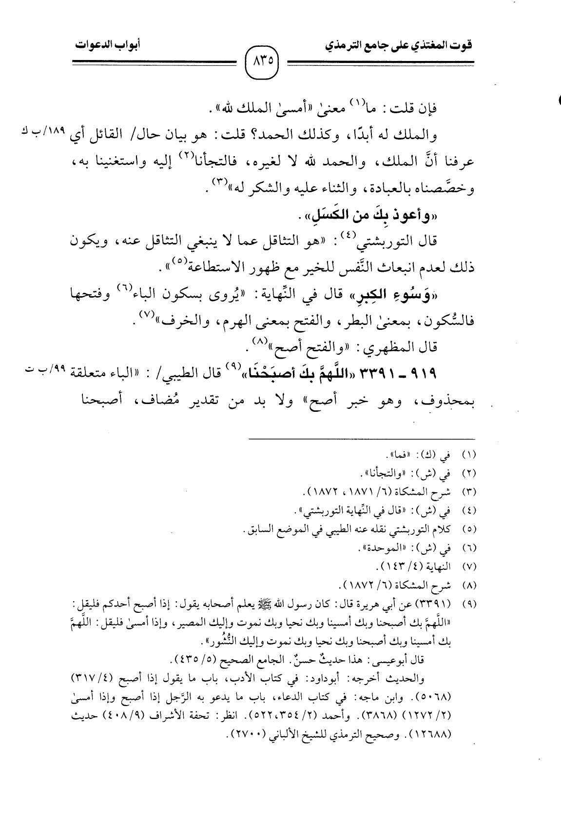 919 -[3391] "اللَّهمَّ بكَ أصبَحْنَا" قال الطيبي: " الباء متعلقة بمحذوف، وهو خبر أصح " ولا بد من تقدير مُضاف، أصبحنا