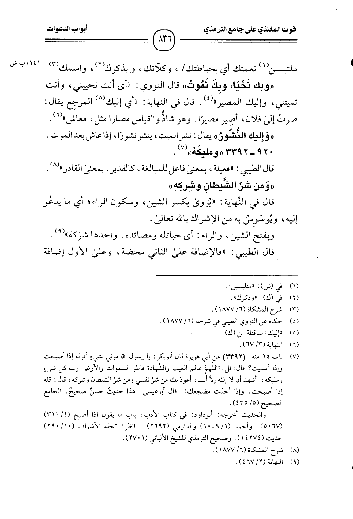 ملتبسين نعمتك أي بحياطتك، وكلآتك، وبذكرك، واسمك "وبك نَحْيَا، وبكَ نَمُوتُ" قال النووي: "أي أنت تحييني، وأنت تميتني، وإليك المصير". قال في النهاية: " أي إليك المرجِع يقال: صرتُ إلى فلان، أصِير مصيرًا. وهو شاذٌّ والقياس مصارا مثل، معاش ".