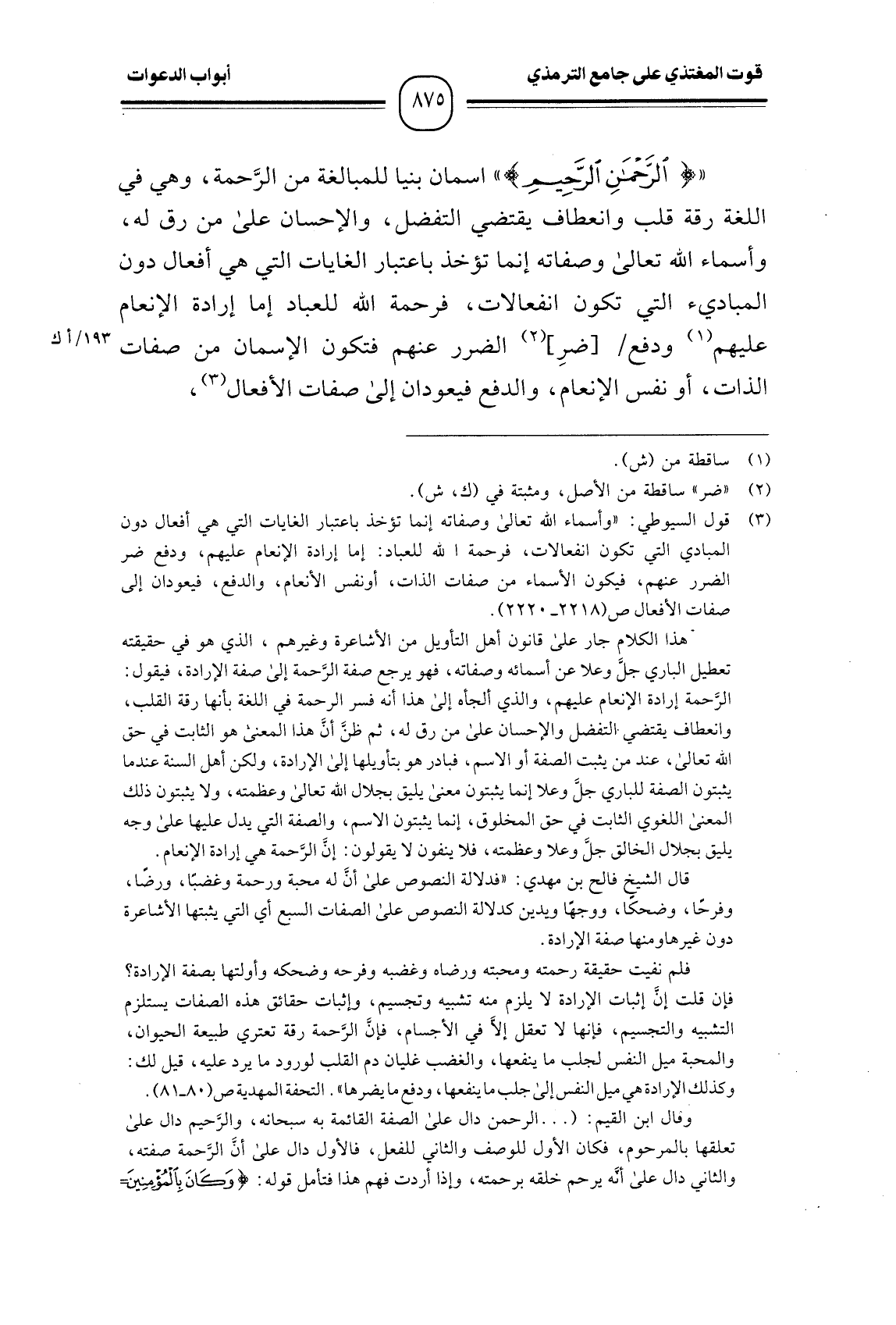 " {الرَّحْمَنِ الرَّحِيمِ} " اسمان بنيا للمبالغة من الرَّحمة، وهي في اللغة رقة قلب وانعطاف يقتضي التفضل، والإحسان على من رق له، وأسماء الله تعالى وصفاته إنما تؤخذ باعتبار الغايات التي هي أفعال دون المباديء التي تكون انفعالات، فرحمة الله للعباد إما إرادة الإنعام عليهم ودفع [ضرِ] الضرر عنهم فتكون الإسمان من صفات الذات، أو نفس الإنعام، والدفع فيعودان إلى صفات الأفعال،