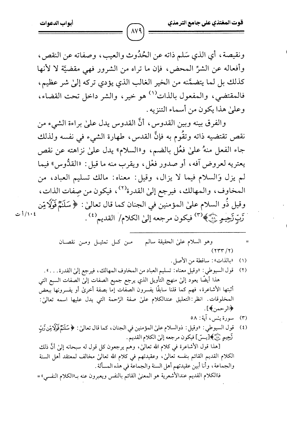 ونقيصة، أي الذي سَلم ذاته عن الحُدُوث والعيب، وصفاته عن النقص، وأفعاله عن الشرِّ المحض، فإن ما تراه من الشرور فهي مقضيَّة لا لأنها كذلك بل لما يتضمَّنه من الخير الغالب الذي يؤدي تركه إلى شر عظيم، فالمقتضي، والمفعول بالذات هو خير، والشر داخل تحت القضاء، وعلى هذا يكون من أسماء التنزيه.