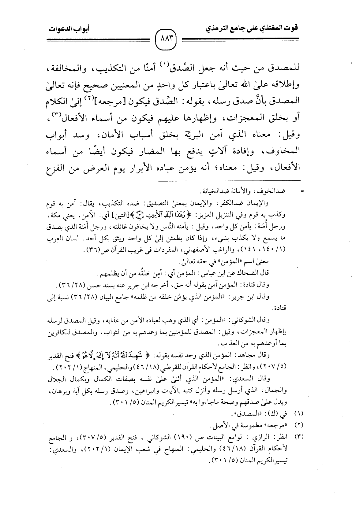 للمصدق من حيث أنه جعل الصِّدق أمنًا من التكذيب، والمخالفة، وإطلاقه على الله تعالى باعتبار كل واحدٍ من المعنيين صحيح فإنه تعالى المصدق بأنَّ صدق رسله، بقوله: الصِّدق فيكون [مرجعه] إلى الكلام أو بخلق المعجزات، وإظهارها عليهم فيكون من أسماء الأفعال، وقيل: معناه الذي آمن البريَّة بخلق أسباب الأمان، وسد أبواب المخاوف، وإفادة آلاتٍ يدفع بها المضار فيكون أيضًا من أسماء الأفعال، وقيل: معناه؛ أنه يؤمن عباده الأبرار يوم العرض من الفزع