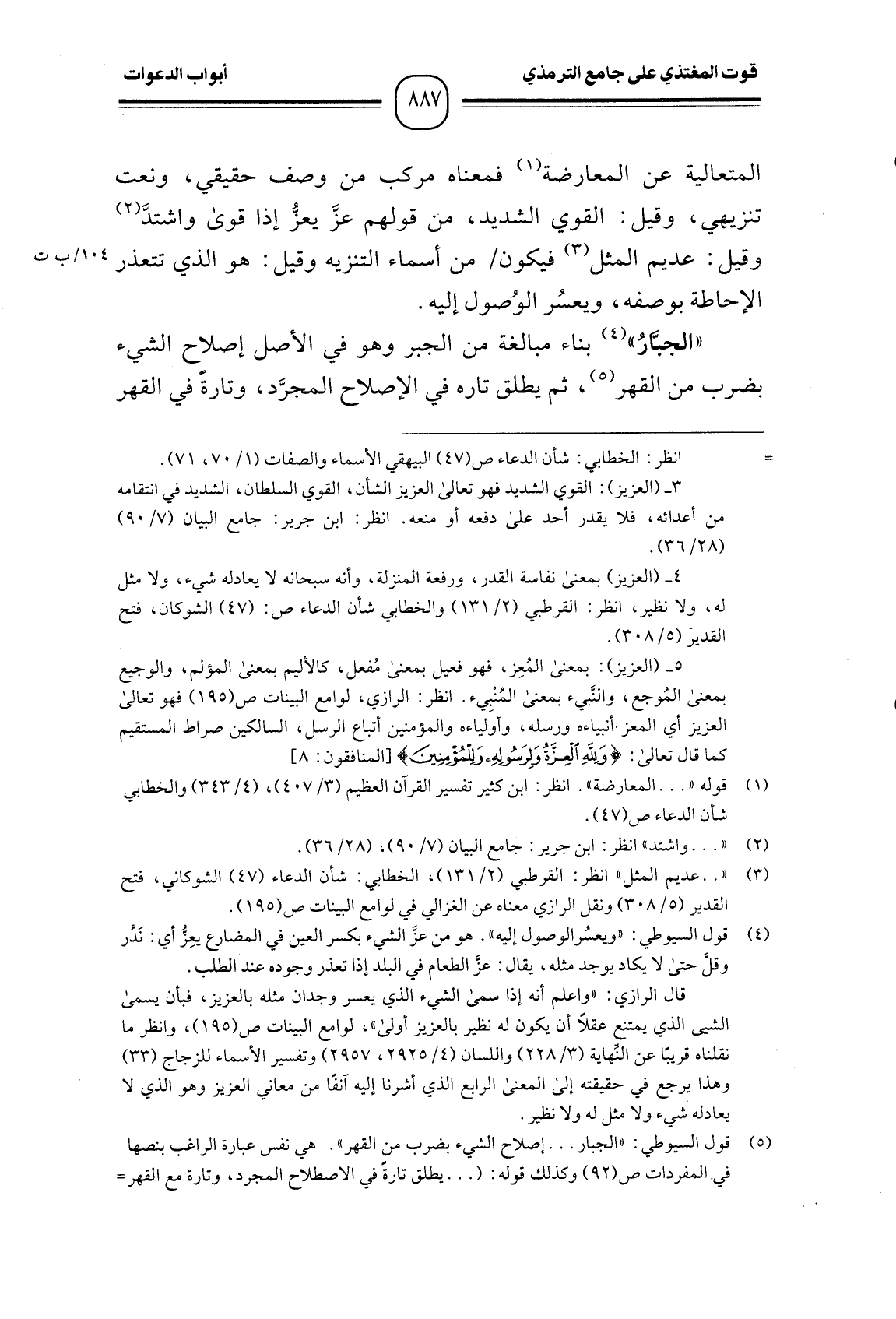 المتعالية عن المعارضة فمعناه مركب من وصف حقيقي، ونعت تنزيهي، وقيل: القوي الشديد، مق قولهم عزَّ يعزُّ إذا قوى واشتدَّ وقيل: عديم المثل فيكون من أسماء التنزيه وقيل: هو الذي تتعذر الإحاطة بوصفه، ويعسُر الوُصول إليه.