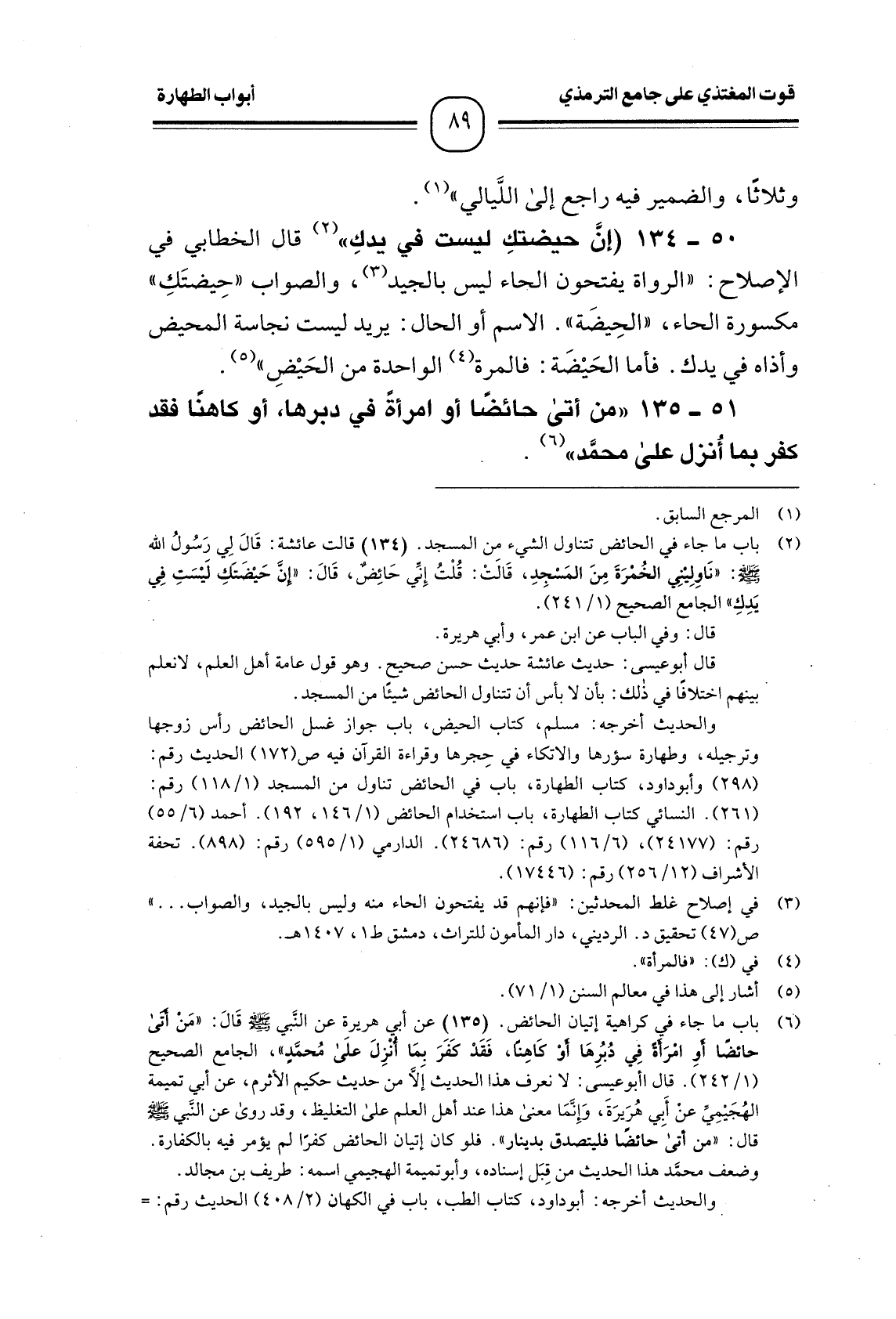 51 -[135] " من أتى حائضًا أو امرأةً في دبرها، أو كاهنًا فقد كفر بما أُنزل على محمَّد " (¬1) .