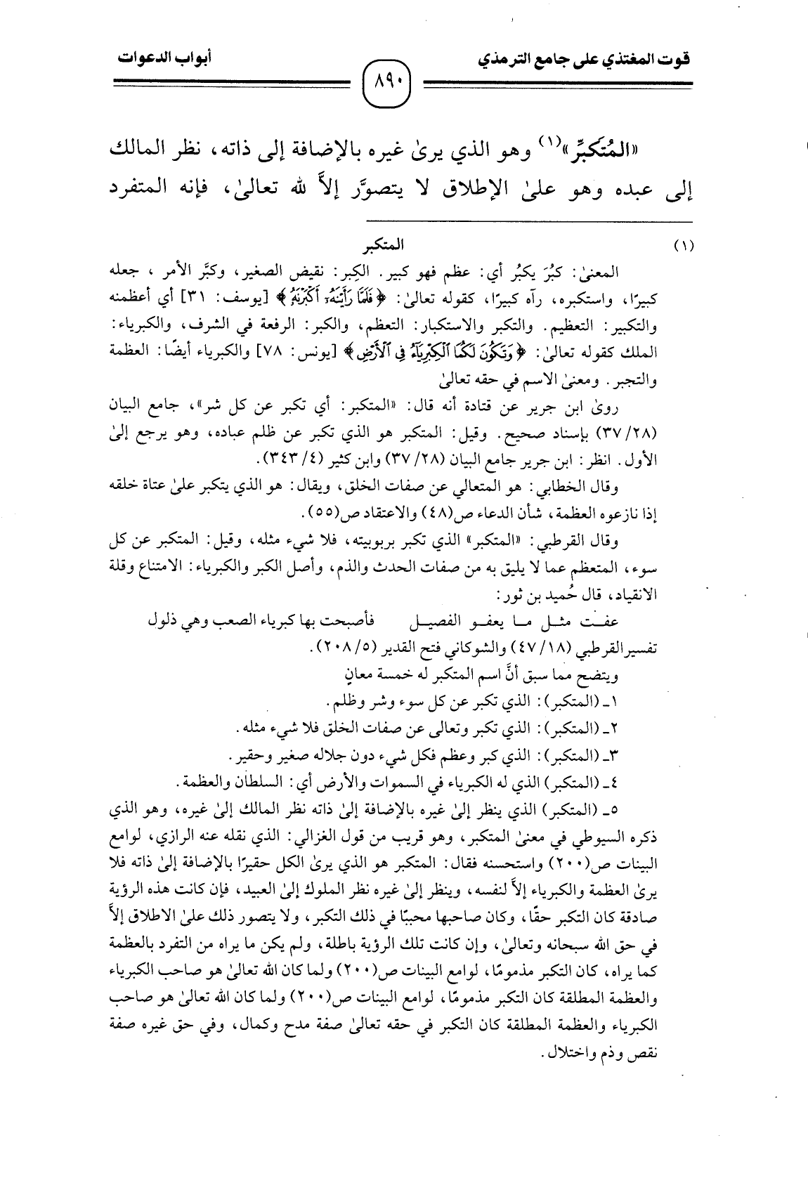 "المُتَكبِّر" وهو الذي يرى غيره بالإضافة إلى ذاته، نظر المالك إلى عبده وهو على الإطلاق لا يتصوَّر إلاَّ لله تعالى، فإنه المتفرد