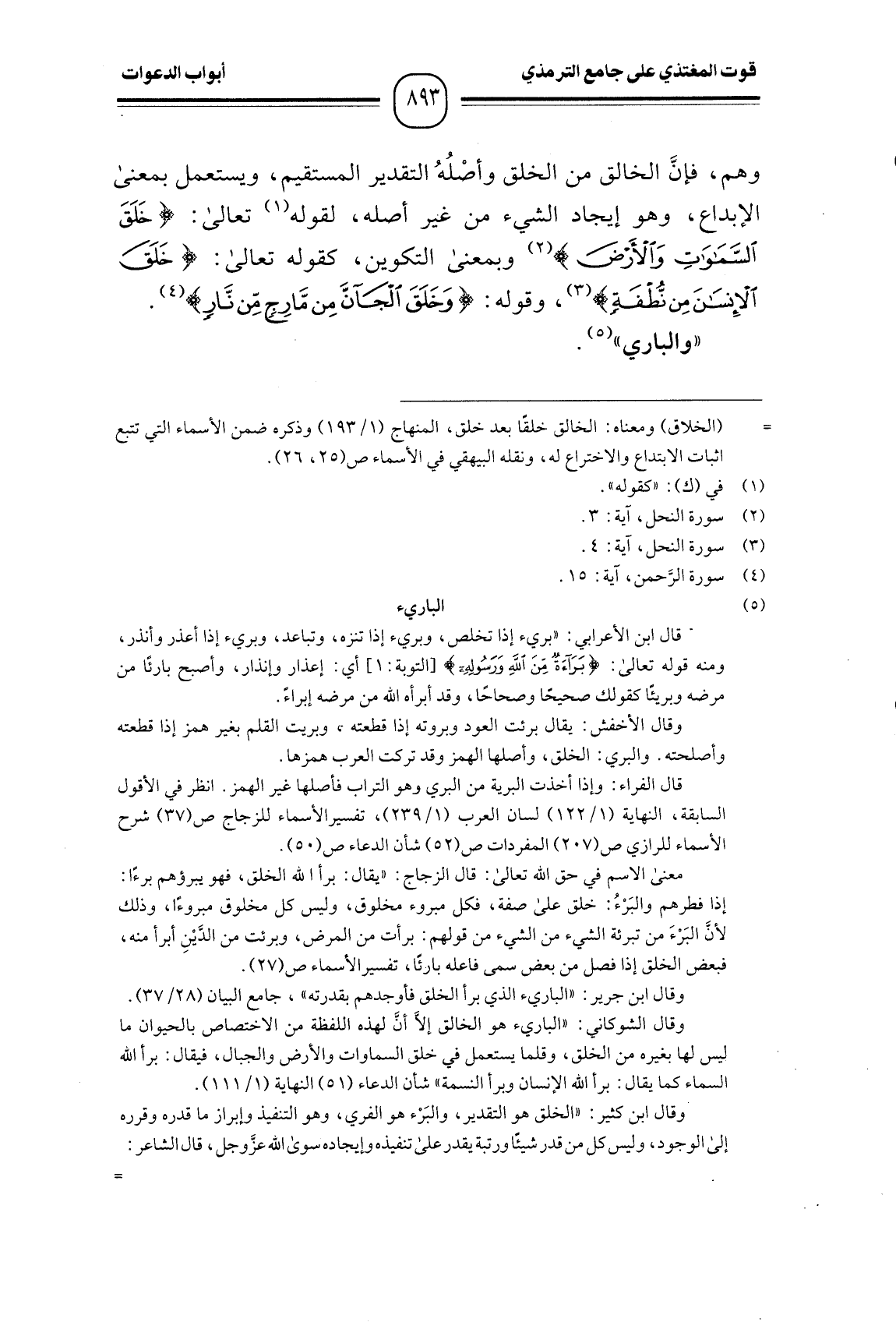 وهم، فإنَّ الخالق من الخلق وأصْلُهُ التقدير المستقيم، ويستعمل بمعنى الإبداع، وهو إيجاد الشيء من غير أصله، لقوله تعالى: {خَلَقَ السَّمَاوَاتِ وَالْأَرْضَ} وبمعنى التكوين، كقوله تعالى: {خَلَقَ الْإِنْسَانَ مِنْ نُطْفَةٍ} ، وقوله: {وَخَلَقَ الْجَانَّ مِنْ مَارِجٍ مِنْ نَارٍ} . " والباري ".