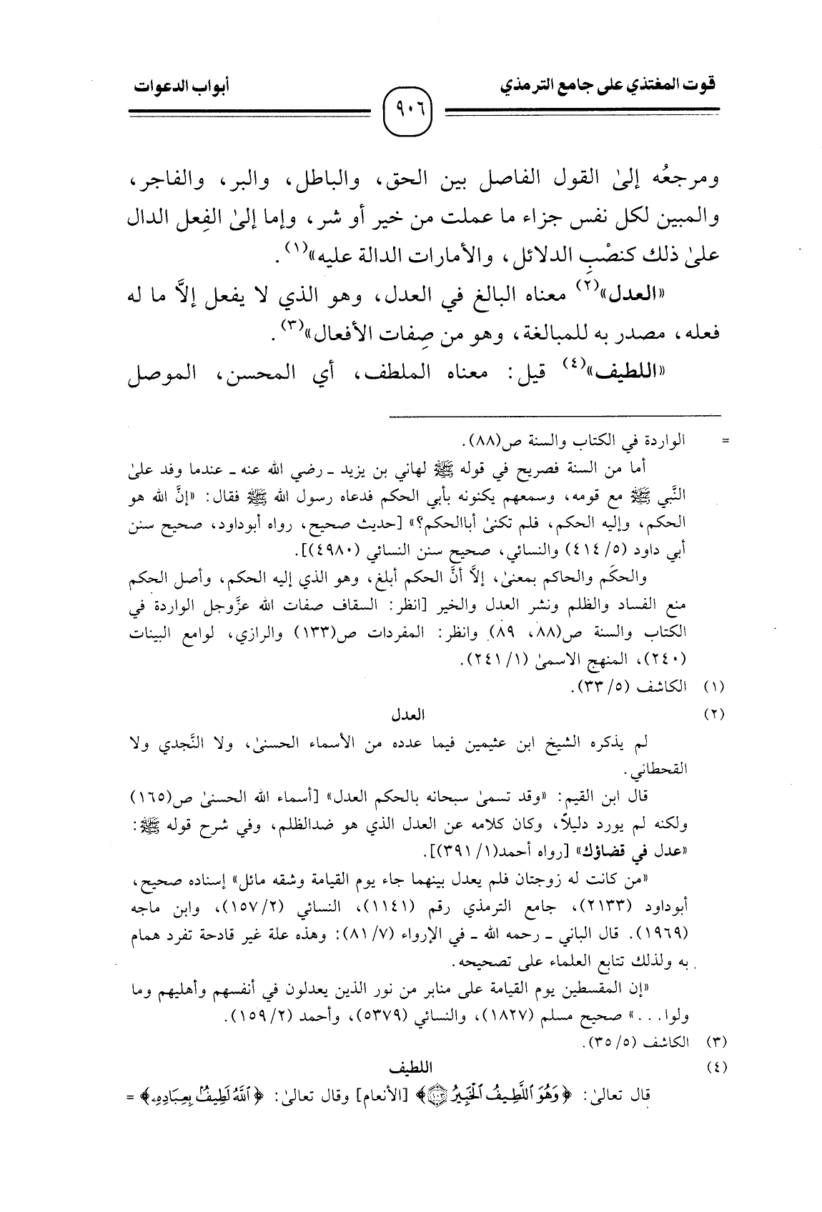 "العدل" معناه البالغ في العدل، وهو الذي لا يفعل إلاَّ ما له فعله، مصدر به للمبالغة، وهو من صفات الأفعال".