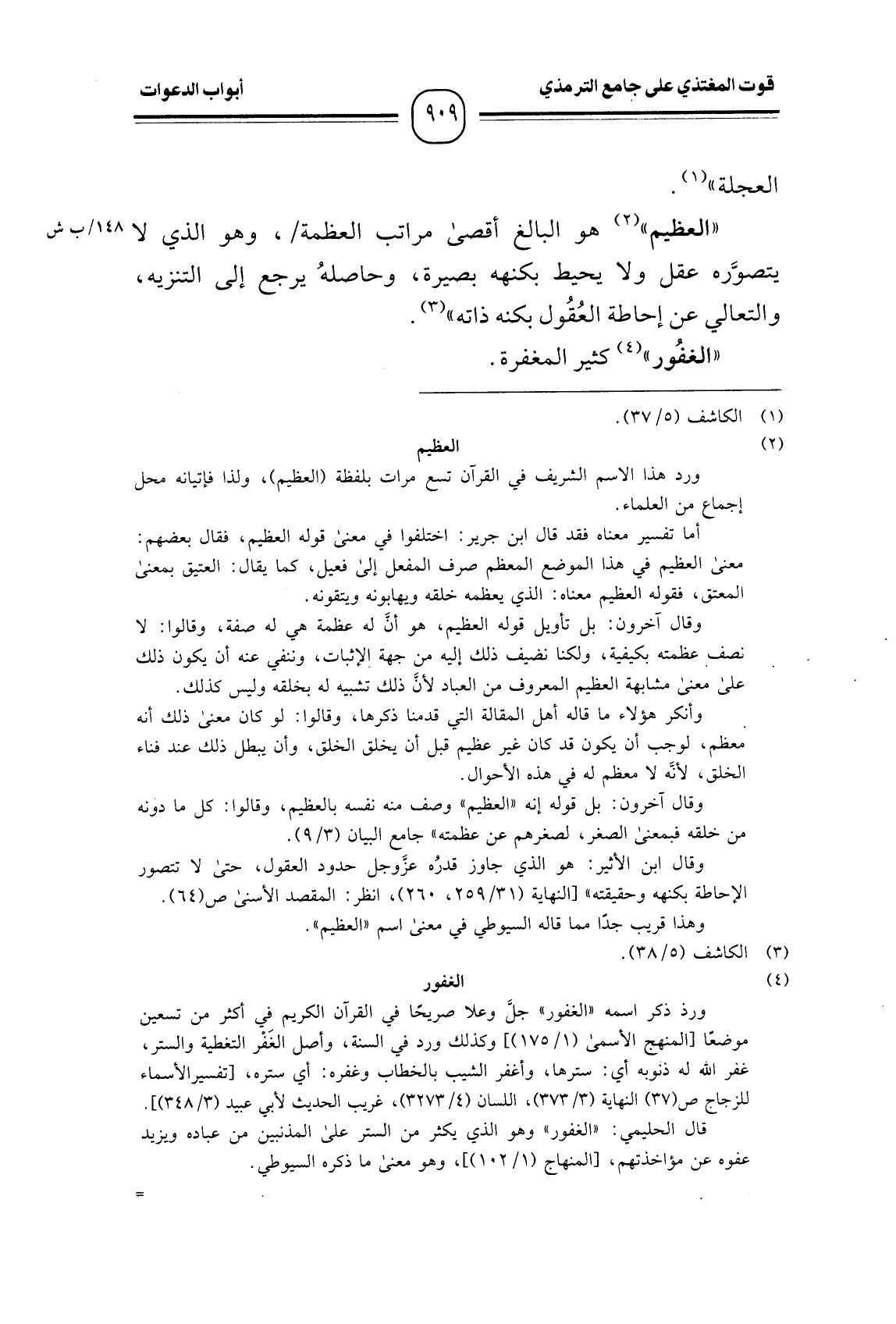 "العظيم" هو البالغ أقصى مراتب العظمة، وهو الذي لا يتصوَّره عقل ولا يحيط بكنهه بصيرة، وحاصلهُ يرجع إلى التنزيه، والتعالي عن إحاطة العُقُول بكنه ذاته".