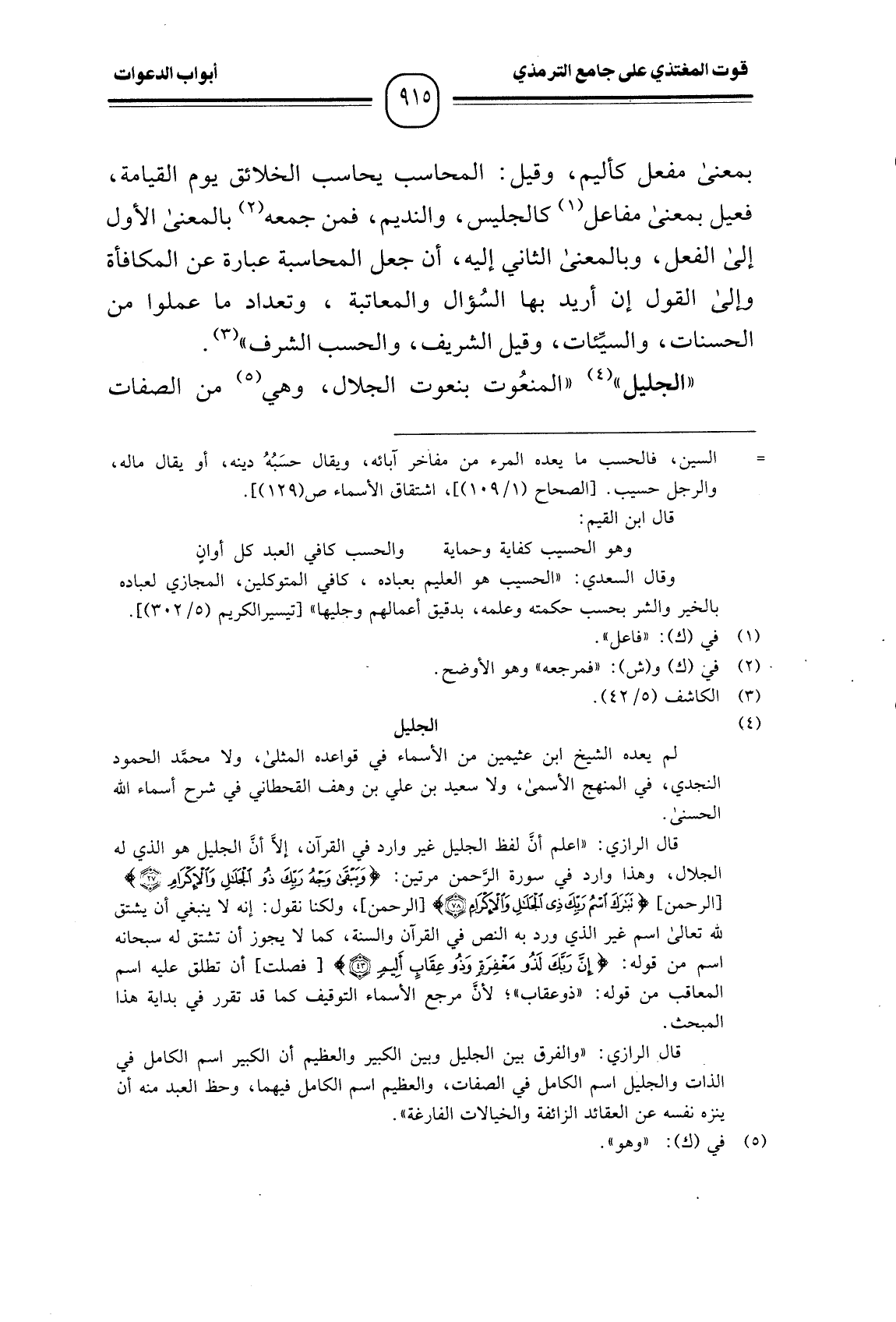 بمعنى مفعل كأليم، وقيل: المحاسب يحاسب الخلائق يوم القيامة، فعيل بمعنى مفاعل كالجليس، والنديم، فمن جمعه بالمعنى الأول إلى الفعل، وبالمعنى الثاني إليه، أن جعل المحاسبة عبارة عن المكافأة وإني القول إن أريد بها السُؤال والمعاتبة، وتعداد ما عملوا من الحسنات، والسيئات، وقيل الشريف، والحسب الشرف".