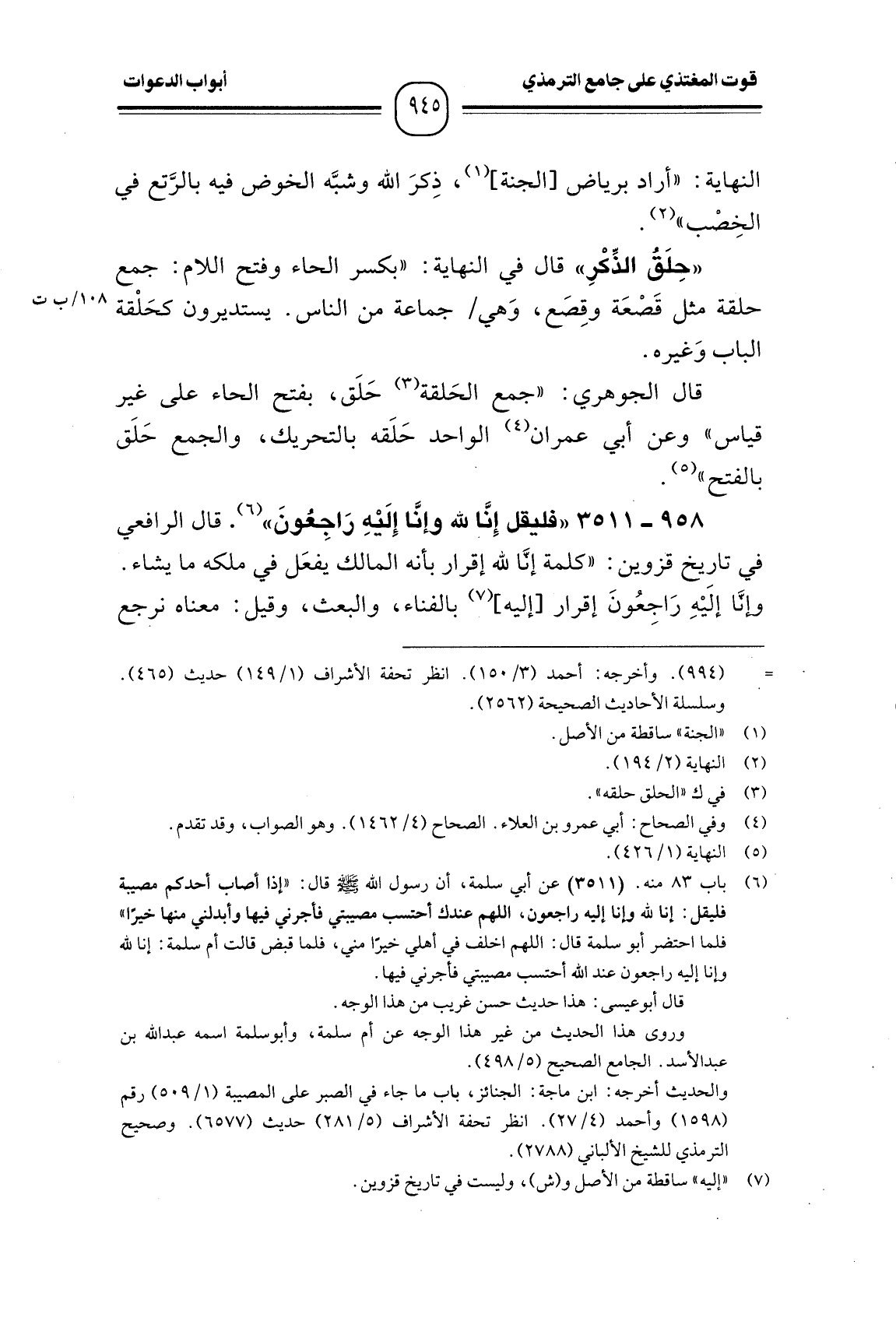 958 -[3511] "فليقل إِنَّا لله وإنَّا إِلَيْهِ رَاجِعُونَ". قال الرافعي في تاريخ قزوين: " كلمة إنَّا لله إقرار بأنه المالك يفعَل في ملكه ما يشاء.
