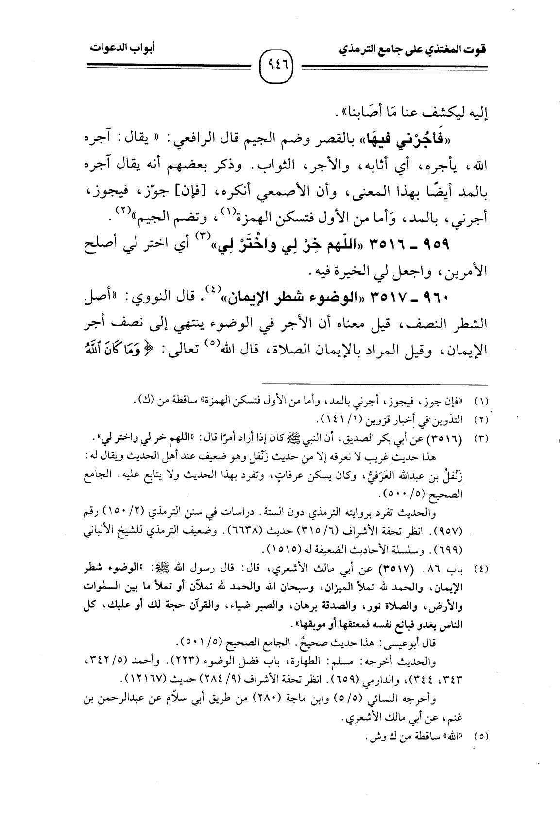960 -[3517] "الوضوء شطر الإيمان". قال النووي: " أصل الشطر النصف، قيل معناه أن الأجر في الوضوء ينتهي إلى نصف أجر الإيمان، وقيل المراد بالإيمان الصلاة، قال الله تعالى: {وَمَا كَانَ اللَّهُ