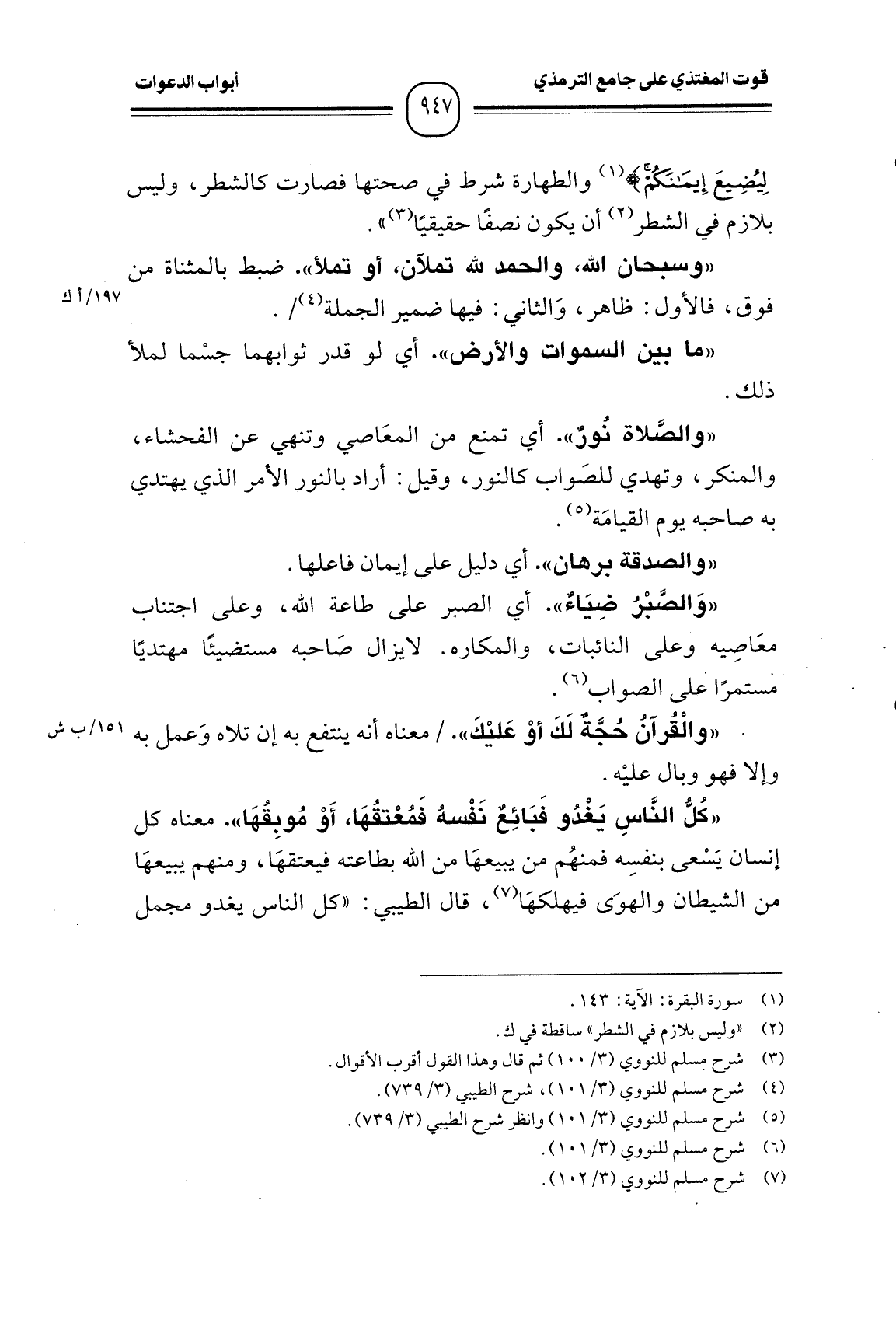 "كُلُّ النَّاسِ يَغْدُو فَبَائِعٌ نَفْسهُ فَمُعْتقُهَا، أَوْ موبِقُهَا". معناه كل إنسان يَسْعى بنفسِه فمنهُم من يبيعهَا من الله بطاعته فيعتقهَا، ومنهم يبيعهَا من الشيطان والهوَى فيهلكهَا، قال الطيبي: "كل الناس يغدو مجمل
