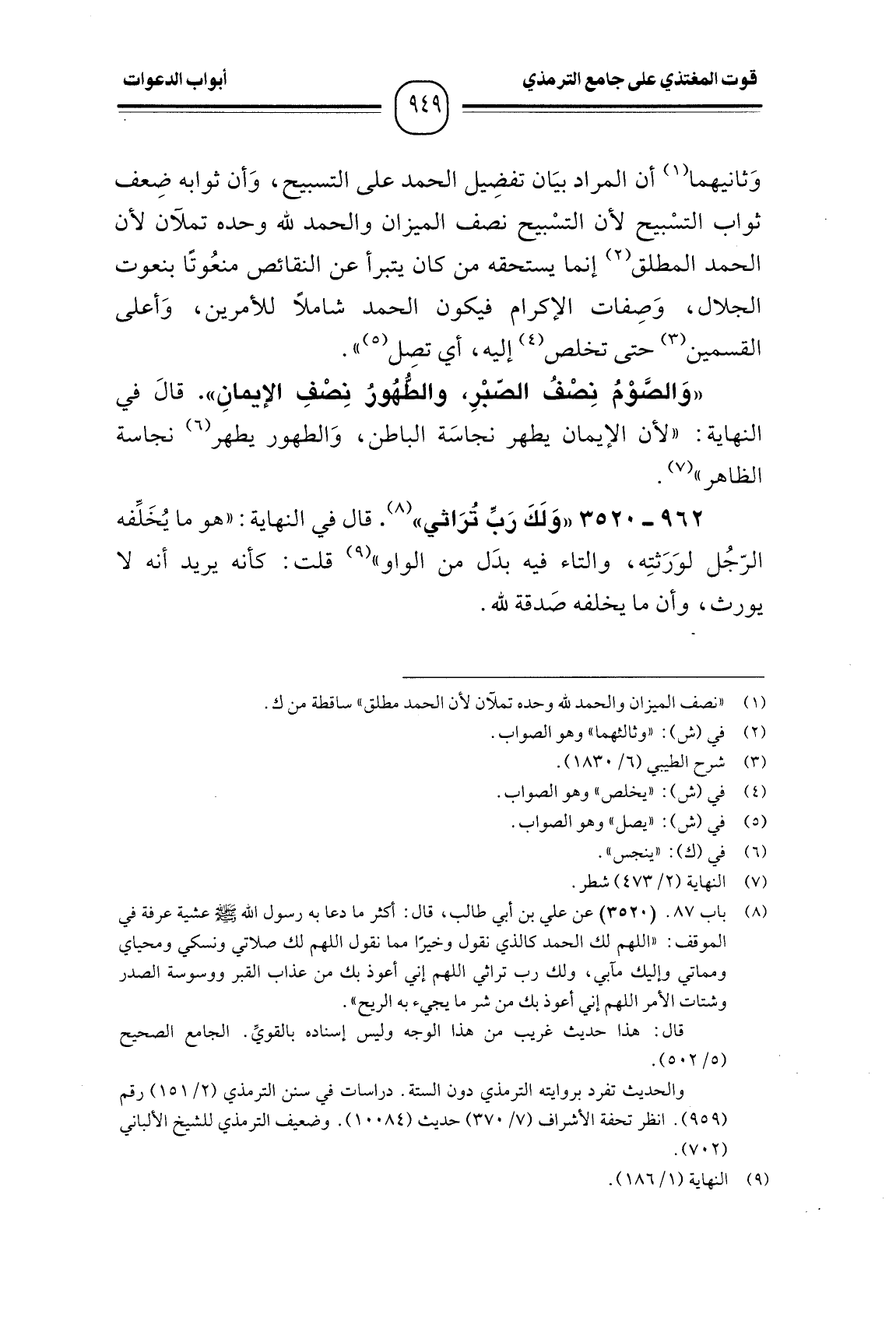 962 -[3520] "وَلَكَ رَبِّ تُرَاثي". قال في النهايهَ: "هو ما يُخَلِّفه الرّجُل لوَرَثتِه، والتاء فيه بدَل من الواو" قلت: كأنه يريد أنه لا يورث، وأن ما يخلفه صَدقة لله.