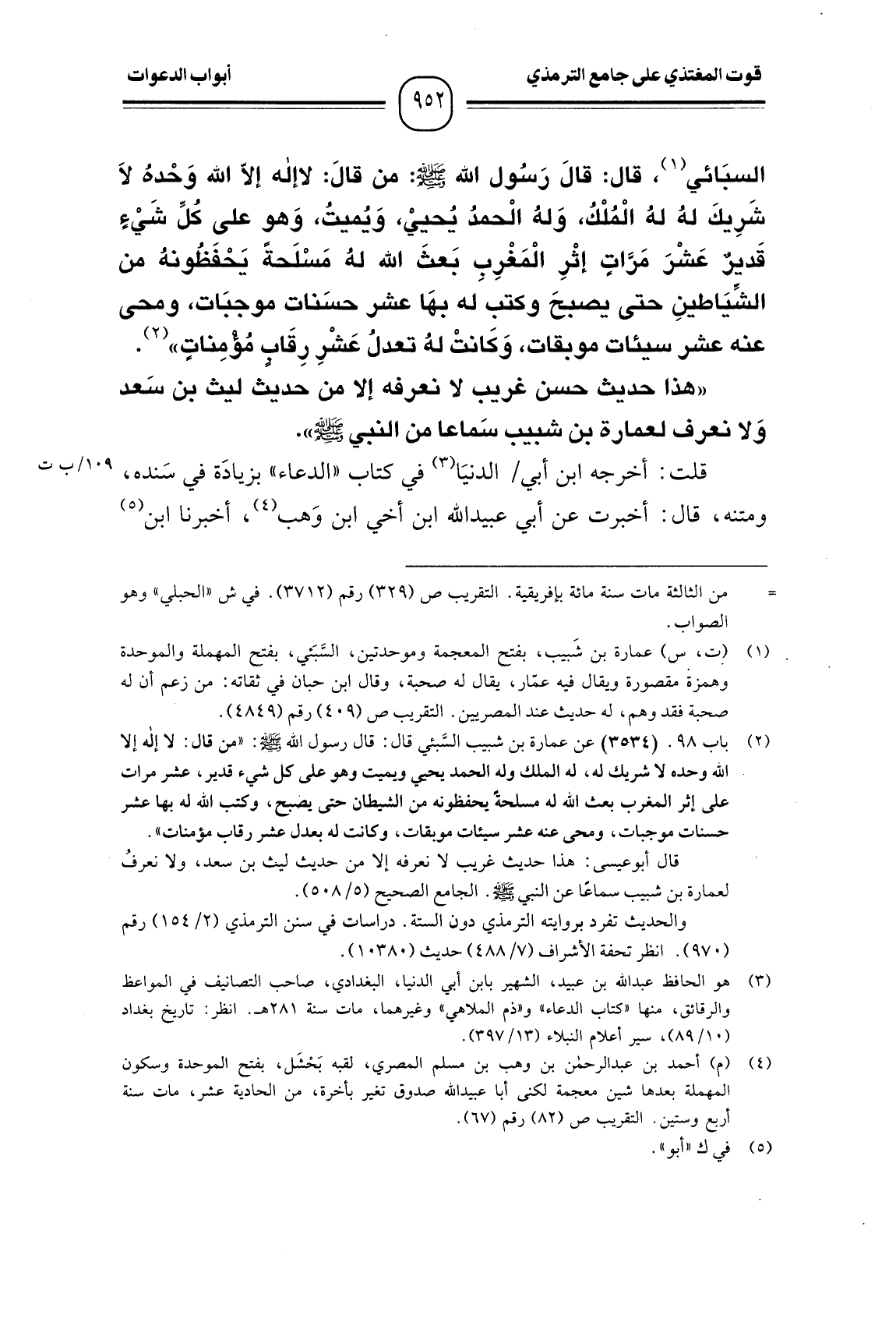 السبَائي، قال: قالَ رَسُول الله - صَلَّى اللَّهُ عَلَيْهِ وَسَلَّمَ -: من قالَ: لا إله إلاّ الله وَحْدهُ لاَ شَرِيكَ لهُ لهُ الْمُلْكُ، وَلهُ الْحمدُ يُحييْ، وَيُميتُ، وَهو على كُلِّ شَيْءٍ قَديرٌ عَشْرَ مَرَّاتٍ إثْرِ الْمَغْرِبِ بَعثَ الله لهُ مَسْلَحةً يَحْفَظُونهُ من الشِّيَاطينِ حتى يصبحَ وكتب له بهَا عشر حسَنات موجبَات، ومحى عنه عشر سيئات موبقات، وَكَانتْ لهُ تعدلُ عَشْرِ رِقَابٍ مُؤمِناتٍ".