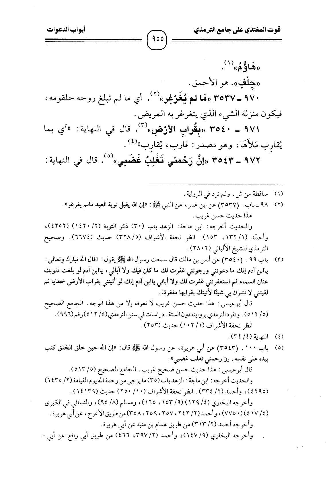 972 -[3543] "إنَّ رَحْمتي تَغْلِبُ غَضَبي". قال في النهاية: