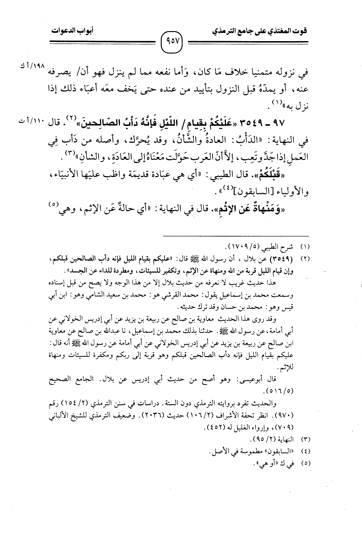 97 -[3549] "عَلَيْكُمْ بِقِيامِ اللّيْلِ فَإنَّهُ دَأْبُ الصّالِحينَ". قال في النهاية: " الدَأْبُ: العادةُ والشَّأنُ، وقد يُحرَّك، وأصله من دَأب فِي العَملِ إذا جَدَّ وتَعِب، إلاَّ أنّ العَرب حَوَّلَت مَعْنَاهُ إلى العَادَةِ، والشأنِ ".