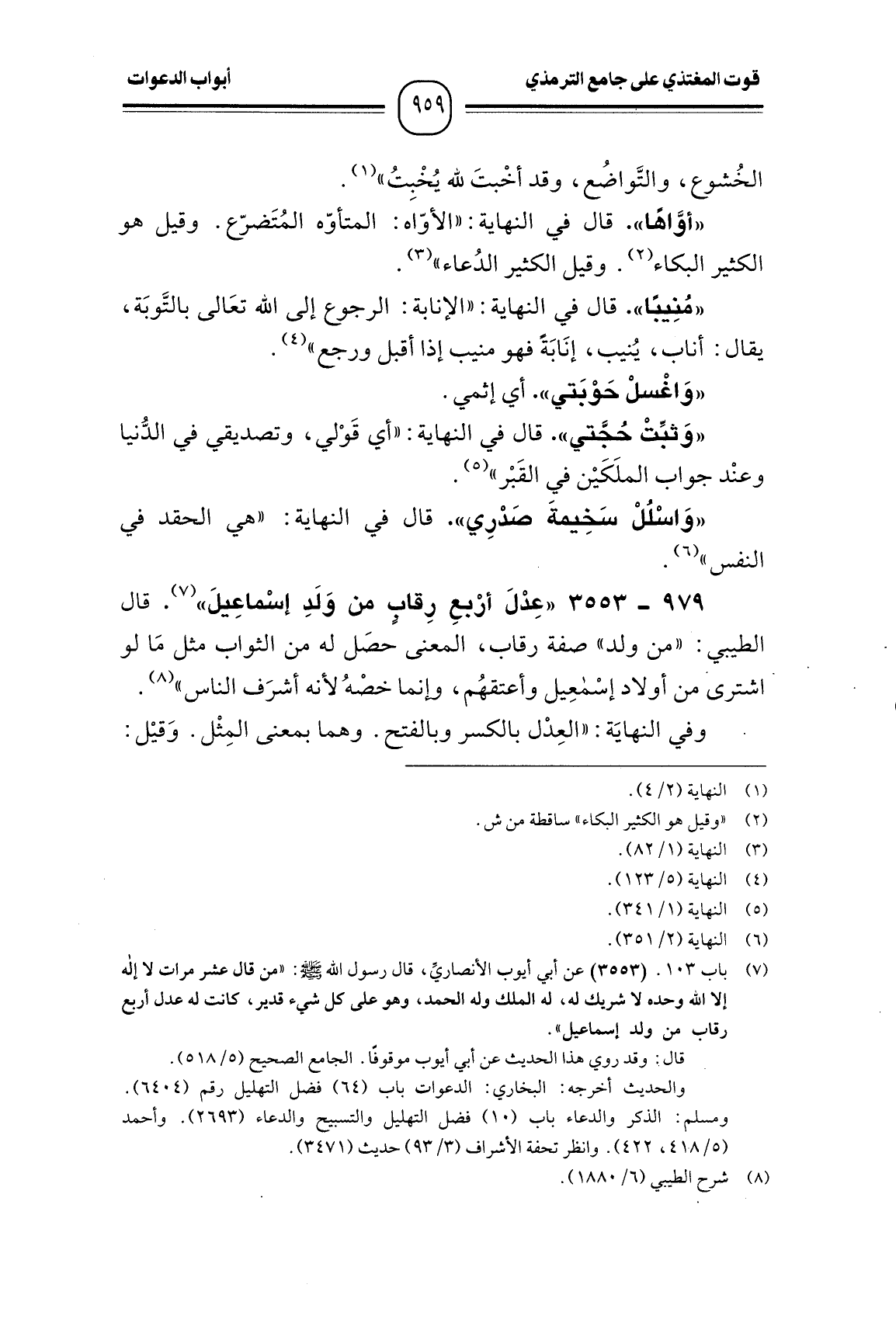 979 -[3553] "عِدْلَ أرْبعِ رِقابٍ من وَلَدِ إسْماعِيلَ". قال الطيبي: "من ولد" صفة رقاب، المعنى حصَل له من الثواب مثل مَا لو اشترى من أولاد إسْمعِيل وأعتقهُم، وإنما خصْهُ لأنه أشرَف الناس".
