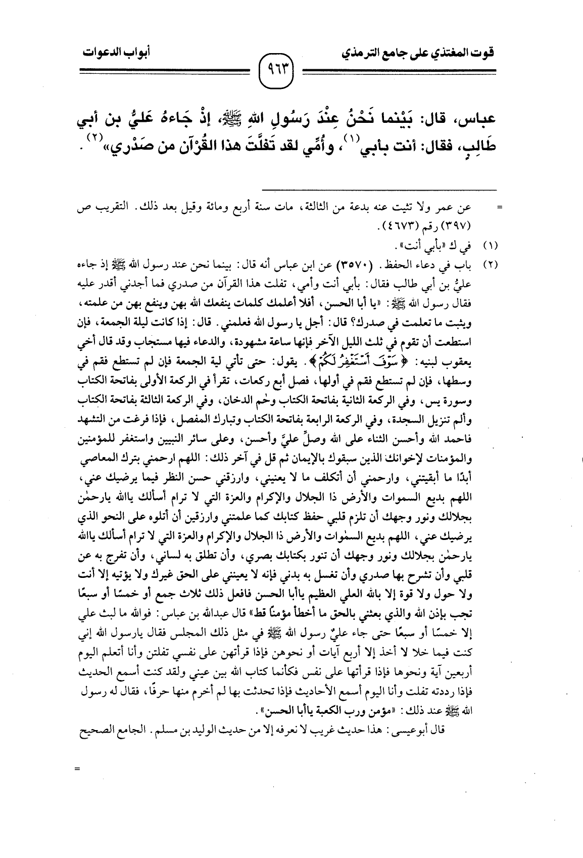 عباس، قال: بَيْنما نَحْنُ عِنْدَ رَسُولِ اللهِ - صَلَّى اللَّهُ عَلَيْهِ وَسَلَّمَ -، إذْ جَاءهُ عَليُّ بن أبي طَالِبٍ، فقال: أنت بأبي، وأُمِّي لقد تَفلَّتَ هذا القُرْآن من صَدْري".